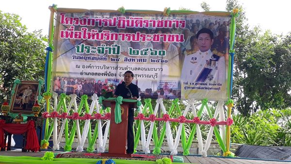 เมื่อวันที่ ๒๔ สิงหาคม ๒๕๖๐ ผู้อำนวยการสำนักงานทรัพยากรน้ำ ภาค ๗ ได้มอบหมายให้ ส่วนประสานและบริหารจัดการลุ่มน้ำท่าจีนโดย นางพัทธ์ธีรา เมฆช้างนักวิเคราะห์นโยบายและแผนชำนาญการ เข้าร่วมโครงการปฏิบัติราชการเพื่อให้บริการประชาชนจังหวัดสุพรรณบุรี ณ ที่ทำการองค์การบริหารส่วนตำบล ดอนมะนาว อำเภอสองพี่น้อง จังหวัดสุพรรณบุรี ว่าที่ร้อยตรี สุพีร์พัฒน์ จองพานิช ผู้ว่าราชการจังหวัดสุพรรณบุรี เป็นประธานเปิดโครงการฯ มีนายอำเภอสองพี่น้อง หัวหน้าส่วนราชการระดับอำเภอ และระดับจังหวัด รวมทั้ง ผู้นำท้องถิ่น ให้การต้อนรับ ผู้ว่าราชการจังหวัดสุพรรณบุรี ได้แนะนำหัวหน้าส่วนราชการระดับจังหวัดที่มาร่วมโครงการ โดยร่วมมอบเงินอุดหนุนสงเคราะห์ครอบครัวผู้มีรายได้น้อยและไร้ที่พึ่ง มอบเงินสงเคราะห์เด็กภายในครอบครัวยากจน รองนายกเหล่ากาชาดจังหวัดสุพรรณบุรี และองค์การบริหารส่วนตำบลดอนมะนาว มอบเครื่องอุปโภค บริโภค ให้แก่ราษฎรตำบลดอนมะนาว จำนวน ๑,๒๐๐ ชุด จากนั้นผู้ว่าราชการจังหวัดสุพรรณบุรี ได้เยี่ยมชมนิทรรศการหน่วยงานส่วนราชการต่าง ๆ ที่มาร่วมให้บริการประชาชน สำหรับส่วนประสานและบริหารจัดการลุ่มน้ำท่าจีน ได้ร่วมจัดบอร์ดประชาสัมพันธ์การบริหารจัดการทรัพยากรน้ำ แจกเอกสารเผยแพร่ความรู้เกี่ยวกับทรัพยากรธรรมชาติ แผ่นพับรณรงค์ประหยัดน้ำ แจกกระเป๋าผ้า และพัดรณรงค์การใช้น้ำอย่างรู้คุณค่า มีผู้เข้ารับบริการ จำนวน ๑๖๑ คน