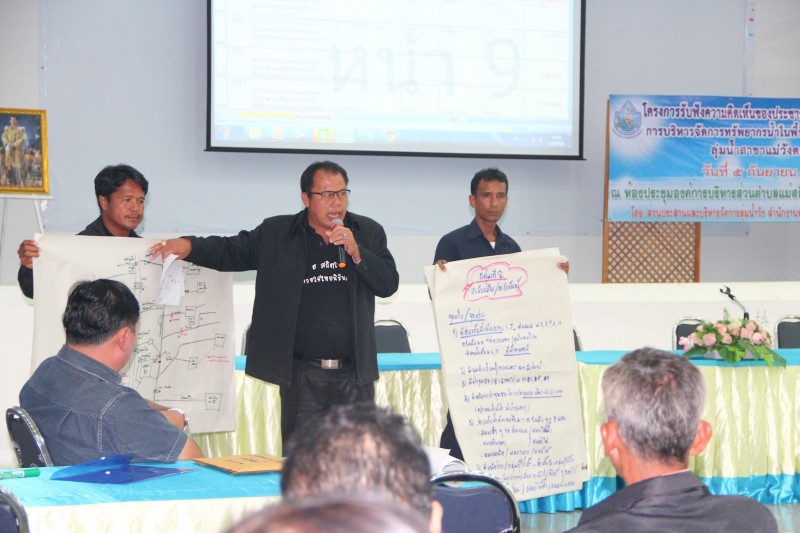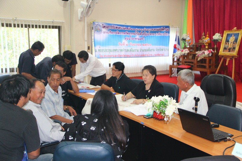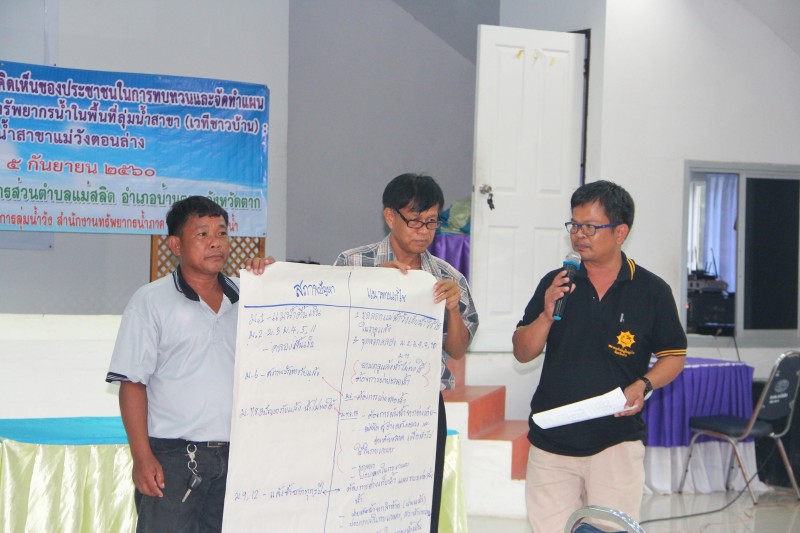 2. วันที่ 5 กันยายน 2560 ลุ่มน้ำสาขาแม่วังตอนล่าง ณ ห้องประชุมองค์การบริหารส่วนตำบลแม่สลิด อำเภอบ้านตาก จังหวัดตาก โดยมีกลุ่มเป้าหมายที่เข้าร่วมประชุมฯ ประกอบด้วย ผู้นำท้องถิ่น ผู้นำชุมชน ผู้นำท้องที่ องค์กรปกครองส่วนท้องถิ่น ในพื้นที่ลุ่มน้ำสาขาแม่วังตอนล่าง ประชาชน เครือข่าย และผู้มีส่วนได้ ส่วนเสียในพื้นที่ลุ่มน้ำสาขาแม่วังตอนล่าง