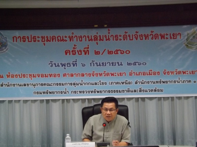 วันพุธที่ 6 กันยายน 2560 สำนักงานทรัพยากรน้ำภาค 1 โดยส่วนประสานและบริหารจัดการลุ่มน้ำกกและโขง (ภาคเหนือ) จัดประชุมคณะทำงานลุ่มน้ำระดับจังหวัดพะเยา ครั้งที่ 2/2560 ณ ห้องประชุมจอมทอง ชั้น 4 ศาลากลางจังหวัดพะเยา อำเภอเมือง จังหวัดพะเยา โดยมี นายประจญ ปรัชญ์สกุล รองผู้ว่าราชการจังหวัดพะเยา เป็นประธานการประชุม นางสาววรรณอนงค์ อุชุโกศลการ ผู้อำนวยการส่วนประสานและบริหารจัดการลุ่มน้ำกกและโขง (ภาคเหนือ) ทำหน้าที่เลขานุการ มีคณะทำงานลุ่มน้ำระดับจังหวัดพะเยา และผู้ร่วมสังเกตการณ์ เข้าร่วมประชุม ในครั้งนี้ ทั้งหมด 37 คน