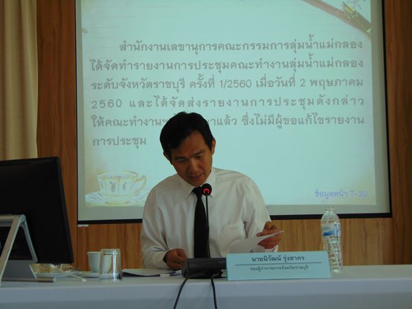 วันพุธที่ ๖ กันยายน ๒๕๖๐ ประชุมคณะทำงานลุ่มน้ำแม่กลองระดับจังหวัดราชบุรี ครั้งที่ ๒/๒๕๖๐ ณ ห้องประชุมโรงแรม เดอะ คาแนลราชบุรี อำเภอเมืองราชบุรี จังหวัดราชบุรี โดยมี นายนิวัฒน์ รุ่งสาคร รองผู้ว่าราชการจังหวัดราชบุรี เป็นประธานการประชุม