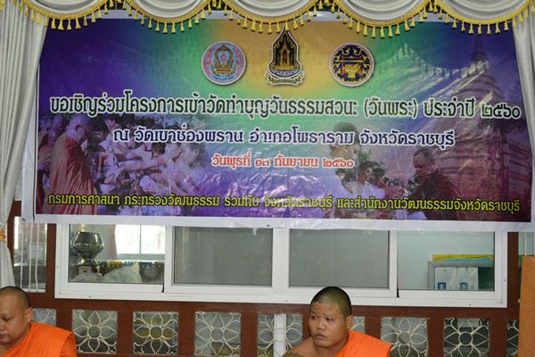 วันที่ 13 กันยายน 2560 สำนักงานทรัพยากรน้ำภาค 7 ร่วมกับหน่วยงานในสังกัดกระทรวงทรัพยากรธรรมชาติและสิ่งแวดล้อม เป็นเจ้าภาพโครงการเข้าวัดทำบุญ วันธรรมสวนะ จังหวัดราชบุรี ประจำปี 2560 ในช่วงเทศกาลเข้าพรรษาณวัดเขาช่องพราน อำเภอโพธาราม จังหวัดราชบุรี โดยมี นางณิทฐา แสวงทอง รองผู้ว่าราชการจังหวัดราชบุรี เป็นประธานในพิธี ในการนี้ นายเวสารัช โสภณดิเรกรัตน์ ผู้อำนวยการสำนักงานทรัพยากรน้ำภาค 7 มอบหมายให้ นางสาวณัฐกาญจน์ แซตั้ง ผู้อำนวยการส่วนยุทธศาสตร์ พร้อมด้วยเจ้าหน้าที่ในสังกัด เข้าร่วมโครงการ