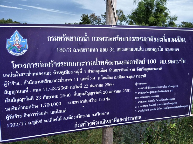 เมื่อวันที่ 20 พฤศจิกายน 2560 สำนักงานทรัพยากรน้ำภาค 11 มอบหมายให้คณะกรรมการตรวจการจ้าง ผู้ควบคุมงานและเจ้าหน้าที่ส่วนวิชาการ ดำเนินการติดตามผลการดำเนินงานโครงการก่อสร้างระบบกระจายน้ำพลังงานแสงอาทิตย์ แหล่งน้ำสระน้ำหนองแซง บ้านคูเมือง หมู่ที่ 4 ตำบลคูเมือง อำเภอวารินชำราบ จังหวัดอุบลราชธานี