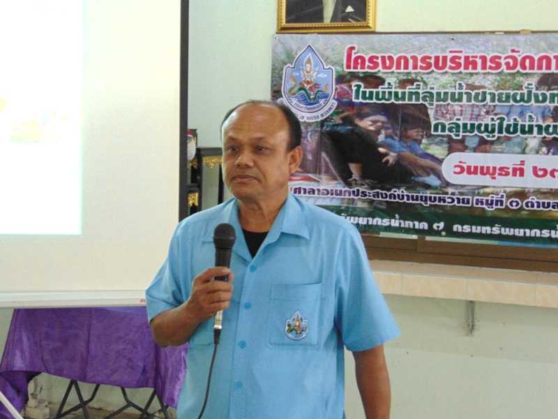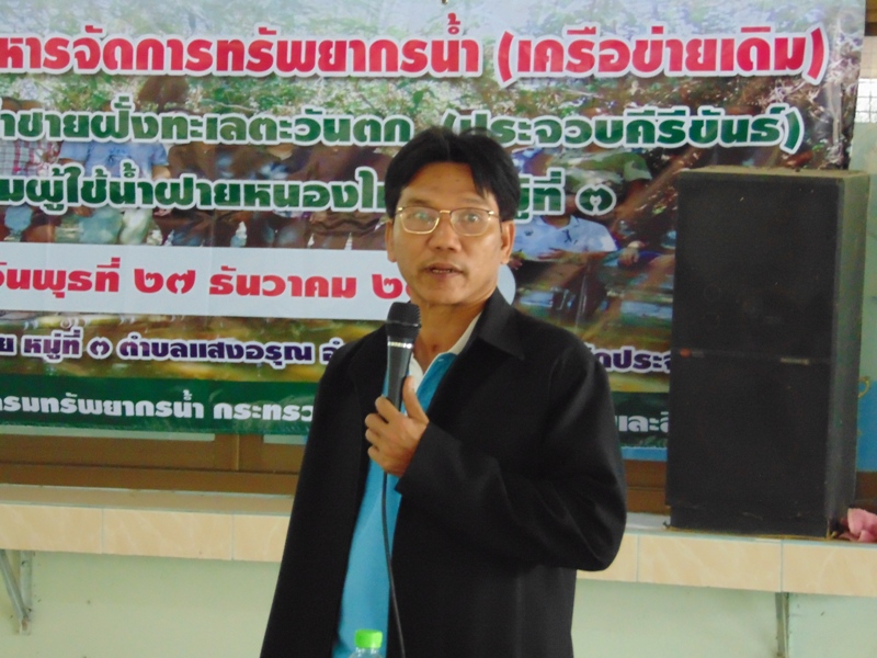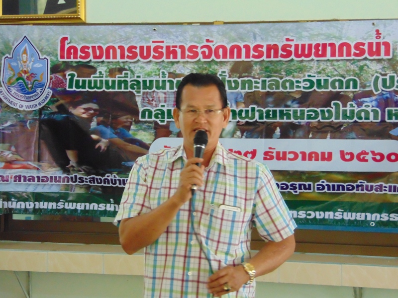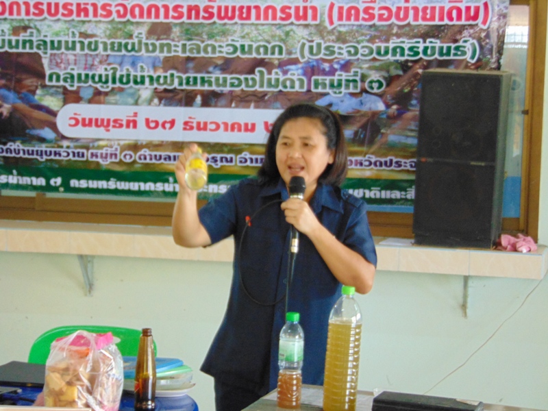 สำนักงานทรัพยากรน้ำภาค ๗ โดยส่วนประสานและบริหารจัดการลุ่มน้ำเพชรบุรีและประจวบคีรีขันธ์ จัดโครงการบริหารจัดการทรัพยากรน้ำ(เครือข่ายเดิม) กลุ่มผู้ใช้น้ำฝายหนองไม้ดำ หมู่ที่ ๓ ตำบลแสงอรุณ อำเภอทับสะแก จังหวัดประจวบคีรีขันธ์ วันพุธที่ ๒๗ ธันวาคม ๒๕๖๐ ณ ศาลาอเนกประสงค์บ้านยุบหวาย หมู่ที่ ๓ ตำบลแสงอรุณ อำเภอทับสะแก จังหวัดประจวบคีรีขันธ์ โดยมี นายสุรศิลป์ ยนปลัดยศ นายกองค์การบริหารส่วนตำบลแสงอรุณ ชี้แจงแนวทางการจัดการน้ำของตำบลแสงอรุณ นางจิรัฏฐ์ ปรานต์ประสิทธิ์ ผู้อำนวยการส่วนสิ่งแวดล้อม สำนักงานทรัพยากรธรรมชาติและสิ่งแวดล้อมจังหวัดประจวบคีรีขันธ์ บรรยายเรื่อง “การจัดการปัญหาคุณภาพสิ่งแวดล้อมด้านน้ำ”นายเชตุ จันทร์ถิ นักวิเคราะห์นโยบายและแผนชำนาญการ สำนักงานทรัพยากรน้ำภาค ๗ บรรยายเรื่อง “ศาสตร์พระราชากับการบริหารจัดการและการดูแลรักษาแหล่งน้ำ”และนายสมศักดิ์ สัจจาพันธ์ นักวิชาการเกษตรชำนาญการพิเศษ สถานีพัฒนาที่ดินประจวบคีรีขันธ์ บรรยายเรื่อง “การปรับปรุงคุณภาพน้ำโดยเทคโนโลยีชีวภาพของกรมพัฒนาที่ดิน”และสาธิตการปฏิบัติทำปุ๋ยน้ำหมักชีวภาพ ผู้เข้าร่วมโครงการ จำนวน ๕๑ คน