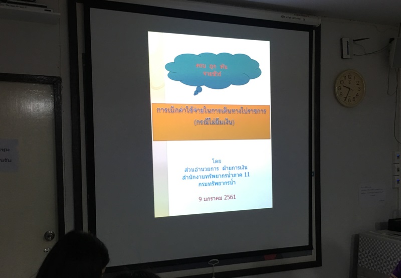 เมื่อวันที่ 9 มกราคม 2561 สำนักงานทรัพยากรน้ำภาค 11 จัดประชุมชี้แจงวิธีปฏิบัติงาน (Work Manual) เรื่องการเบิกค่าใช้จ่ายในการเดินทางไปราชการ (กรณีไม่ยืมเงิน) เพื่อให้การบริการด้านการเบิก จ่ายเงินราชการแก่ผู้รับบริการ เป็นไปอย่างรวดเร็ว ถูกต้องตามกฎหมายและระเบียบฯ รวมถึงมีขั้นตอนการปฏิบัติงานที่ชัดเจนทั้งผู้รับบริการและเจ้าหน้าที่ผู้ให้บริการ โดยมีนายวิเวช สุทธิประภา ผู้อำนวยการสำนักงานทรัพยากรน้ำภาค 11 เป็นประธาน ณ ห้องประชุมสำนักงานทรัพยากรน้ำภาค 11 จังหวัดอุบลราชธานี