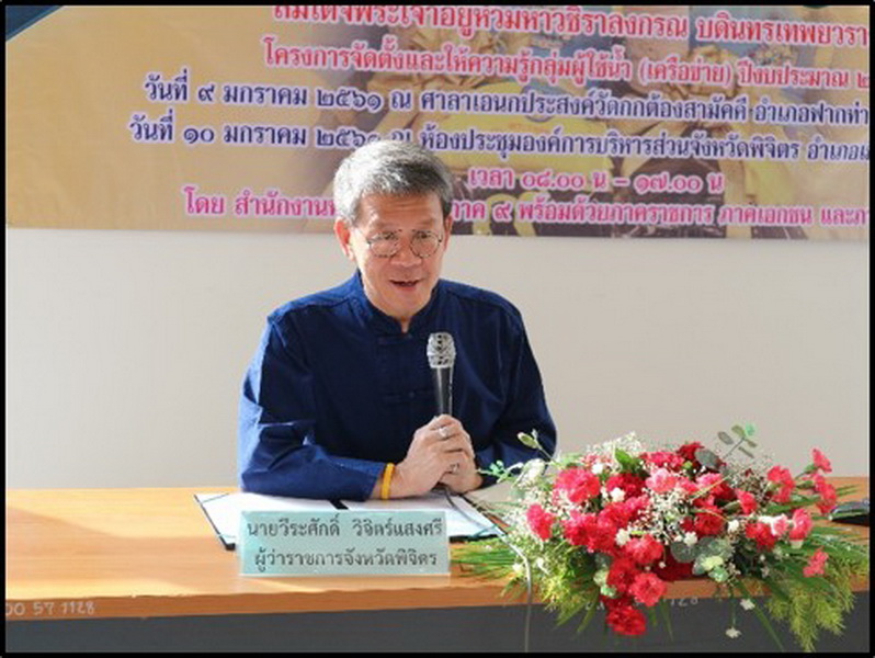 เมื่อวันที่ 10 มกราคม 2561 สำนักงานทรัพยากรน้ำภาค 9 โดยส่วนประสานและบริหารจัดการลุ่มน้ำน่าน ได้ดำเนินการจัดตั้งและให้ความรู้กลุ่มผู้ใช้น้ำ (เครือข่าย) ณ ห้องประชุมองค์การบริหารส่วนจังหวัดพิจิตรโดยมีนายวีระศักดิ์ วิจิตร์แสงศรี ผู้ว่าราชการจังหวัดพิจิตร ได้ให้เกียรติเป็นประธานในพิธีเปิดโครงการฯพร้อมทั้งให้แนวคิดในการดำเนินกิจกรรมให้ทุกภาคส่วนช่วยกันฟื้นฟูและพัฒนาให้แม่น้ำพิจิตรเก่าและแหล่งน้ำที่สำคัญภายในจังหวัดพิจิตร ให้กลับมามีชีวิตและอุดมสมบูรณ์อีกครั้ง พร้อมทั้งให้กำลังใจกับผู้ที่มาเข้าร่วมกิจกรรมในครั้งนี้