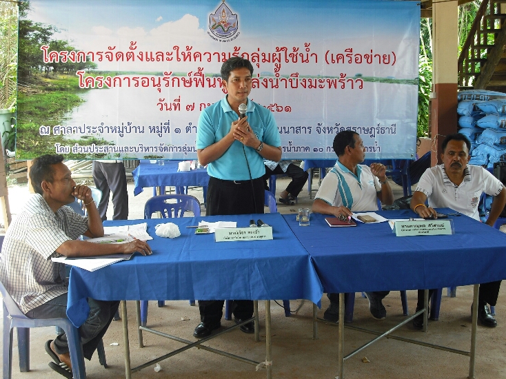 วันนี้ ( 7 กุมภาพันธ์ 2561) นายสาธิต รัตนสิงห์ ผู้อำนวยการสำนักงานทรัพยากรน้ำภาค 10 มอบหมายให้ส่วนประสานและบริหารจัดการลุ่มน้ำตาปี จัดโครงการจัดตั้งและให้ความรู้กลุ่มผู้ใช้น้ำ โครงการอนุรักษ์ฟื้นฟูแหล่งน้ำบึงมะพร้าว ณ ศาลาประจำหมู่บ้าน หมู่ที่ 1 ตำบลน้ำพุ อำเภอบ้านนาสาร จังหวัดสุราษฎร์ธานี ซึ่งที่ประชุมได้คัดเลือกคณะกรรมการ 15 คน เพื่อบริหารจัดการโครงการดังกล่าวให้เกิดความคุ้มค่า มีผู้เข้าร่วม 125 คน