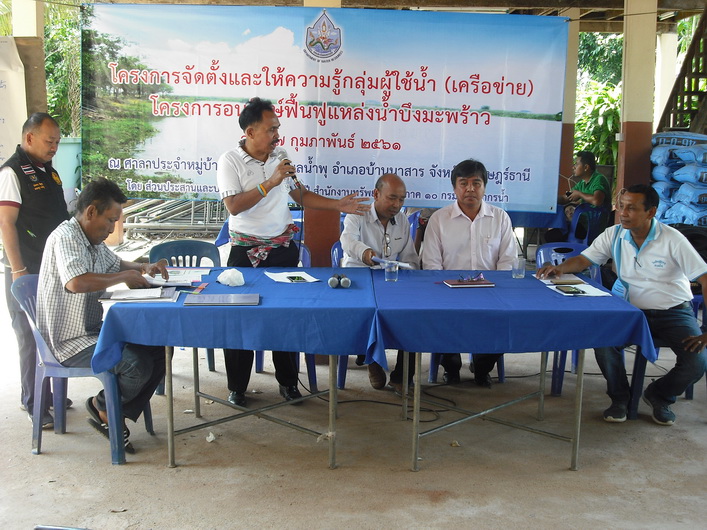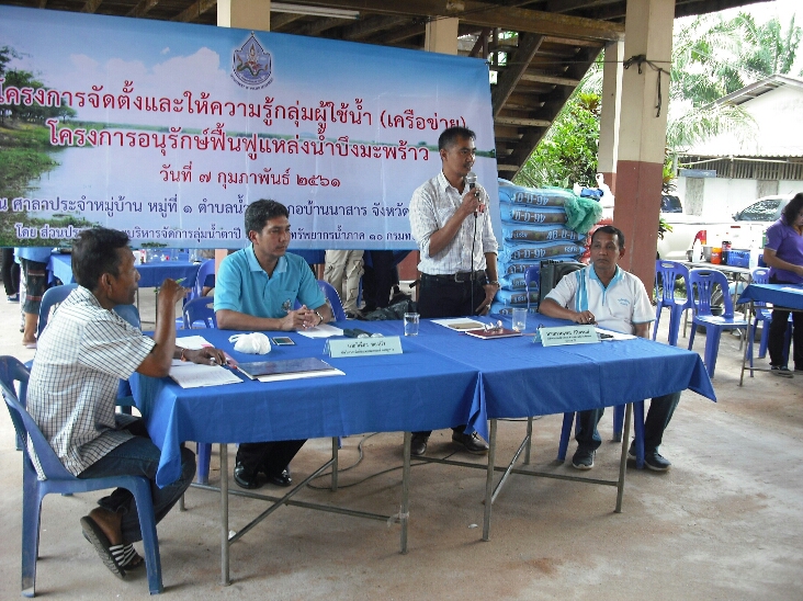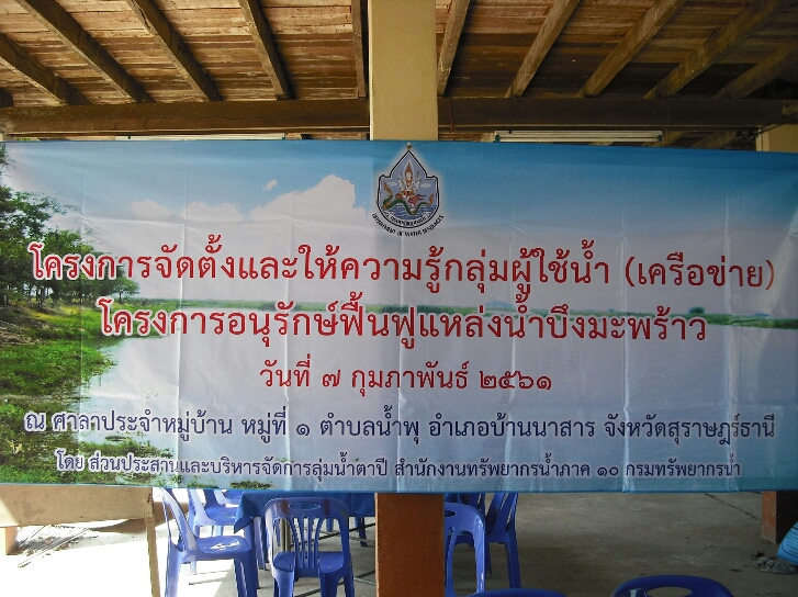 เมื่อวันที่ 7 กุมภาพันธ์ 2561 นายสาธิต รัตนสิงห์ ผู้อำนวยการสำนักงานทรัพยากรน้ำภาค 10 มอบหมายให้ส่วนประสานและบริหารจัดการลุ่มน้ำตาปี จัดโครงการจัดตั้งและให้ความรู้กลุ่มผู้ใช้น้ำ โครงการอนุรักษ์ฟื้นฟูแหล่งน้ำบึงมะพร้าว ณ ศาลาประจำหมู่บ้าน หมู่ที่ 1 ตำบลน้ำพุ อำเภอบ้านนาสาร จังหวัดสุราษฎร์ธานี ซึ่งที่ประชุมได้คัดเลือกคณะกรรมการ 15 คน เพื่อบริหารจัดการโครงการดังกล่าวให้เกิดความคุ้มค่า มีผู้เข้าร่วม 125 คน