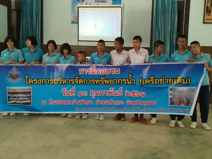 เมื่อวันที่ 13 กุมภาพันธ์ 2561 นายสาธิต รัตนสิงห์ ผู้อำนวยการสำนักงานทรัพยากรน้ำภาค 10 มอบหมายให้ส่วนประสานและบริหารจัดการลุ่มน้ำภาคใต้ฝั่งตะวันออกส่วนที่ 1 จัดฝึกอบรมโครงการบริหารจัดการทรัพยากรน้ำ(เครือข่ายเดิม) ณ โรงเรียนท่าข้ามวิทยา อำเภอท่าแซะ จังหวัดชุมพร โดยมีวัตถุประสงค์ เพื่อสนับสนุนกลุ่มเครือข่ายให้มีการบริหารจัดการทรัพยากรน้ำ รวมทั้งเพิ่มความเข้มแข็งของกลุ่มเครือข่าย และ เพื่อสนับสนุนกิจกรรมการดำเนินงานของกลุ่มเครือข่ายให้มีการบริหารจัดการกลุ่มเครือข่ายอย่างต่อเนื่อง ผู้เข้าร่วมโครงการประกอบด้วยสมาชิกเครือข่ายนักเรียน เข้าร่วมกิจกรรม จำนวน 108 คน
