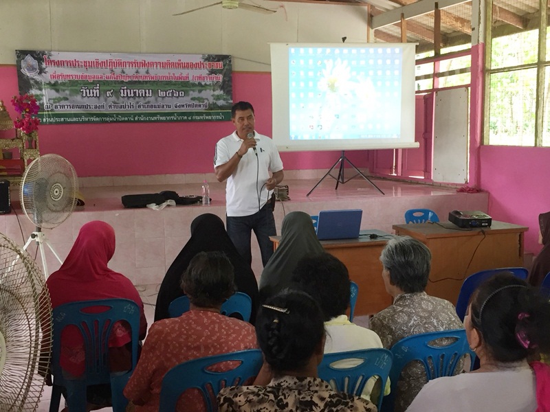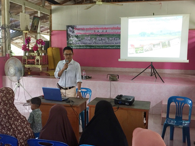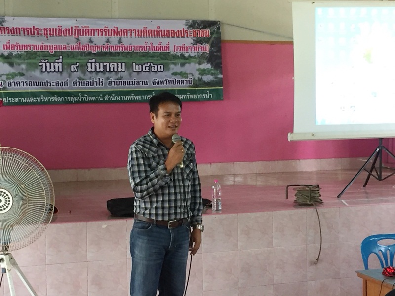 วันที่ 9 มีนาคม 2561 นายไกรสร เพ็งสกุล ผู้อำนวยการสำนักงานทรัพยากรน้ำภาค 8 มอบหมายให้นายนราพงษ์ บุญช่วย ผู้อำนวยการส่วนประสานและบริหารจัดการลุ่มน้ำปัตตานี และเจ้าหน้าที่จัดประชุมเชิงปฏิบัติการรับฟังความคิดเห็นของประชาชนเพื่อรับทราบข้อมูลและแก้ไขปัญหาด้านทรัพยากรน้ำในพื้นที่ (เวทีชาวบ้าน)ณ อาคารอเนกประสงค์ ตำบลบ้านไร่ อำเภอแม่ลาน จังหวัดปัตตานี ผู้เข้าร่วมประชุมประกอบด้วย องค์กรลุ่มน้ำ ผู้นำชุมชน ประชาชนผู้มีส่วนได้ส่วนเสียในพื้นที่ลุ่มน้ำสาขาแม่น้ำปัตตานีจังหวัดยะลาและจังหวัดปัตตานี จำนวน 70 คน ทั้งนี้เพื่อรับทราบปัญหาและความต้องการในการบริหารจัดการทรัพยากรน้ำและทรัพยากรอื่น ๆ ที่เกี่ยวข้องและเกิดขึ้นในพื้นที่ลุ่มน้ำสาขา หาแนวทางแก้ไขปัญหาการบริหารจัดการทรัพยากรน้ำ โดยกระบวนการมีส่วนร่วมของประชาชน และผู้มีส่วนได้ส่วนเสียในพื้นที่ และเป็นเวทีเปิดโอกาสให้มีการแลกเปลี่ยนข้อมูลข่าวสาร ประสบการณ์ เพื่อหาแนวทางป้องกัน และแก้ไขปัญหาที่เกิดขึ้นในลุ่มน้ำ