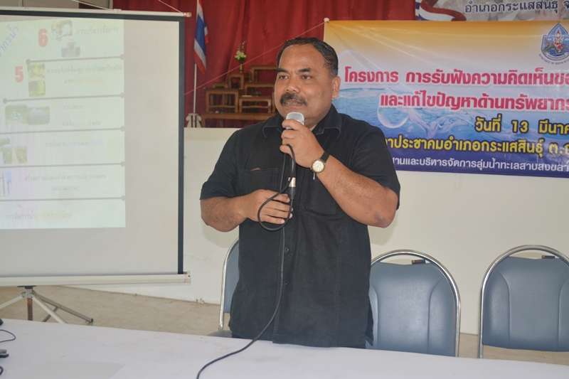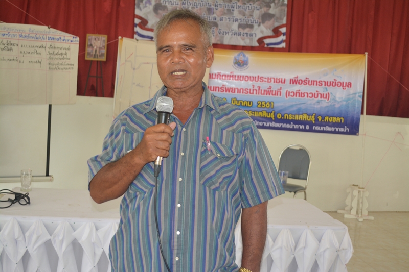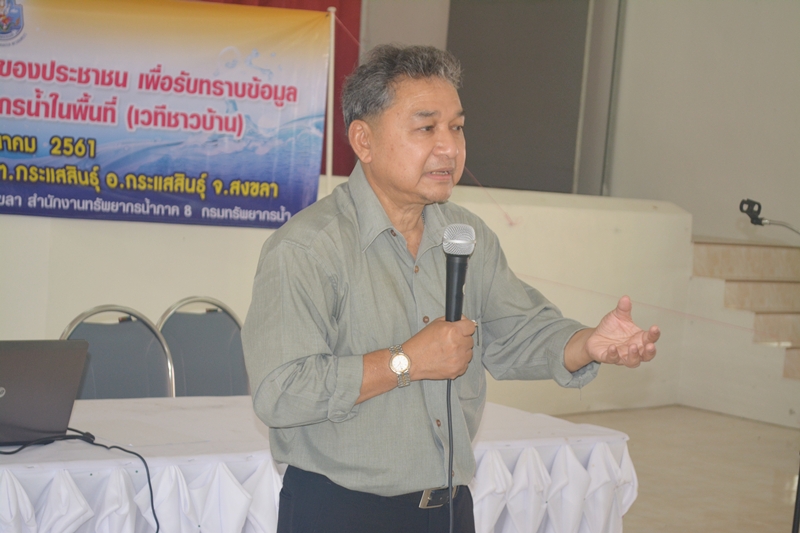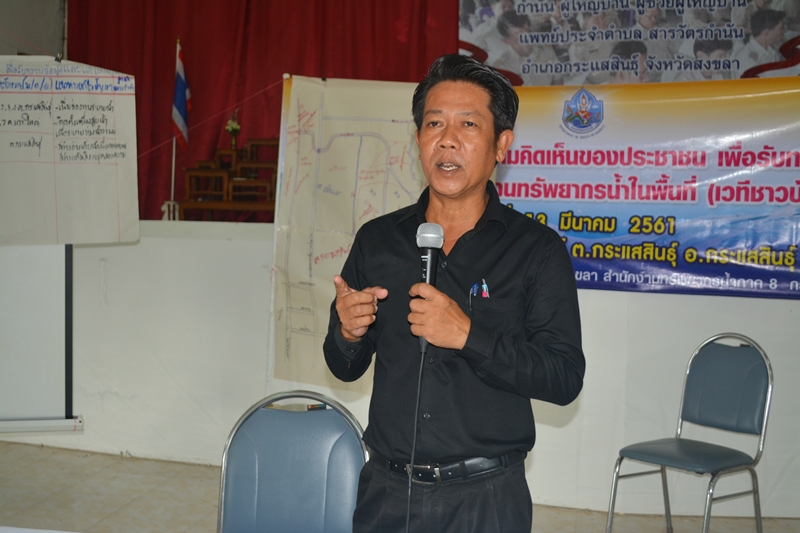 วันที่ 13 มีนาคม 2561 นายไกรสร เพ็งสกุล ผู้อำนวยการสำนักงานทรัพยากรน้ำภาค 8 มอบหมายให้นายสัมพันธ์ ดุลยาภรณ์ ผู้อำนวยการส่วนประสานและบริหารจัดการลุ่มน้ำทะเลสาบสงขลา และเจ้าหน้าที่จัดประชุมโครงการ การรับฟังความคิดเห็นของประชาชนเพื่อรับทราบข้อมูลและแก้ไขปัญหาด้านทรัพยากรน้ำในพื้นที่ (เวทีชาวบ้าน) โดยได้รับเกียรติจากนายโสภณ ไชยวงศ์ นายกเทศมนตรีตำบลกระแสสินธุ์ เป็นประธานเปิดโครงการ ณ ศาลาประชาคมอำเภอกระแสสินธุ์ ต.กระแสสินธุ์ อ.กระแสสินธุ์ จ.สงขลา ผู้เข้าร่วมประชุมประกอบด้วย ประชาชนผู้มีส่วนได้ส่วนเสียในพื้นที่ลุ่มน้ำ องค์กรลุ่มน้ำ เจ้าหน้าที่และผู้สังเกตการณ์ จำนวน 79 คน โดยมีวัตถุประสงค์ดังนี้