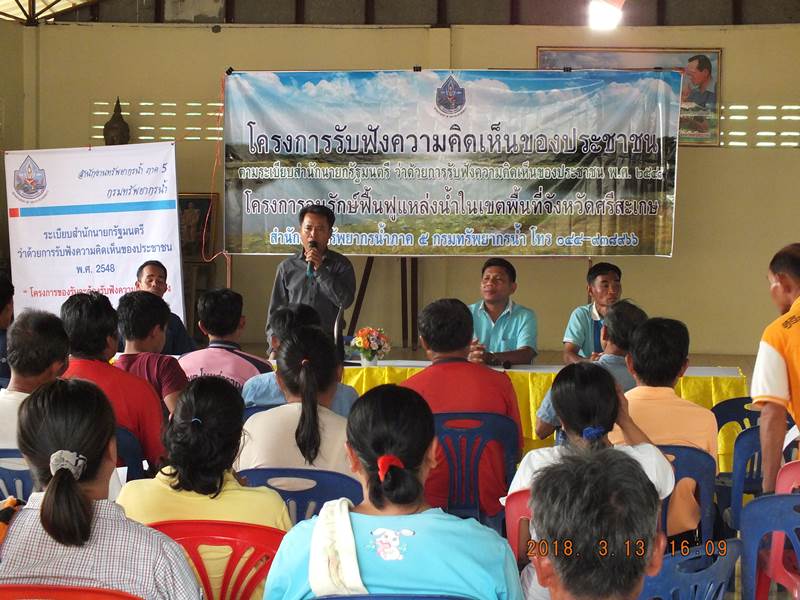 นายดำรงค์ นำพาโชคชัย ผู้อำนวยการสำนักงานทรัพยากรน้ำภาค 5 มอบหมายให้ส่วนอุทกวิทยา ดำเนินโครงการรับฟังความคิดเห็นของประชาชน ตามระเบียบสำนักนายกรัฐมนตรีว่าด้วยการรับฟังความคิดเห็นของประชาชน พ.ศ. 2548 โครงการอนุรักษ์ฟื้นฟูแหล่งน้ำแก้มลิงหน้าฝายบ้านโนนสำเริง หมู่ที่ 11 ตำบลโนนสำราญ อำเภอกันทรลักษ์ จังหวัดศรีสะเกษ ในวันอังคารที่ 13 มีนาคม 2561 เวลา 16.30-18.30 น. ณ ศาลาอเนกประสงค์บ้านโนนสำเริง หมู่ที่ 11