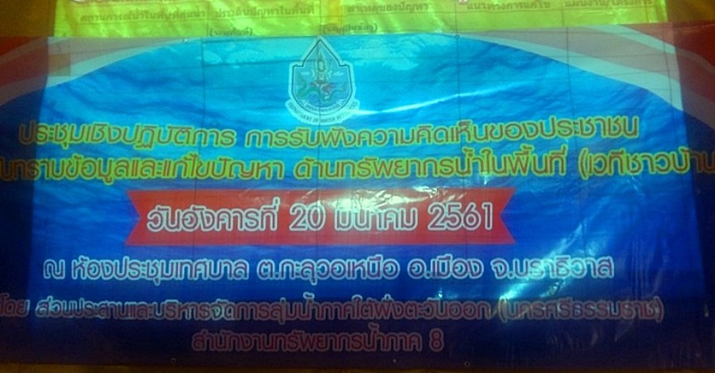 เมื่อระหว่างวันที่ 20-21 มีนาคม 2561 นายไกรสร เพ็งสกุล ผู้อำนวยการสำนักงานทรัพยากรน้ำภาค 8 มอบหมายให้ นายโสภณ สัสดีอำไพ ผู้อำนวยการส่วนประสานและบริหารจัดการลุ่มน้ำภาคใต้ฝั่งตะวันออก พร้อมเจ้าหน้าที่ร่วมดำเนินการจัดประชุมโครงการ การรับฟังความคิดเห็นของประชาชนเพื่อรับทราบข้อมูลและแก้ไขปัญหาด้านทรัพยากรน้ำในพื้นที่ (เวทีชาวบ้าน) จำนวน 2 ครั้ง โดยในวันที่ 20 มีนาคม 2561 จัดประชุม ณ ห้องประชุมเทศบาลตำบลกะลุวอเหนือ อำเภอเมือง จังหวัดนราธิวาส และในวันที่ 21 มีนาคม 2561 จัดประชุม ณ ห้องประชุมโรงเรียนสุวรรณไพบูลย์ ตำบลยามู อำเภอยะหริ่ง จังหวัดปัตตานี มีผู้เข้าร่วมประชุมประกอบด้วย ประชาชนผู้มีส่วนได้ส่วนเสียในพื้นที่ลุ่มน้ำ องค์กรลุ่มน้ำ เจ้าหน้าที่และผู้สังเกตการณ์ ทั้ง 2 ครั้ง รวมจำนวน 109 คน ในการจัดประชุมดังกล่าวได้รับเกียรติจาก รองศาสตราจารย์ ดร.วิชิต เรืองแป้น และ ดร.ประดับ นวลละออง จากมหาวิทยาลัยราชภัฏยะลา ร่วมให้ความรู้ในเรื่องรูปแบบการขับเคลื่อน การสังเคราะห์องค์ความรู้ การจัดการลุ่มน้ำเพื่อความยั่งยืนในอนาคต แก่ผู้เข้าร่วมประชุมฯ อีกด้วย ทั้งนี้มีวัตถุประสงค์เพื่อรับทราบปัญหาและความต้องการในการบริหารจัดการทรัพยากรน้ำและทรัพยากรอื่น ๆ ที่เกี่ยวข้อง ที่เกิดขึ้นในพื้นที่ลุ่มน้ำสาขา และหาแนวทางแก้ไขปัญหาการบริหารจัดการทรัพยากรน้ำ โดยกระบวนการมีส่วนร่วมของประชาชนและผู้มีส่วนได้ส่วนเสียในพื้นที่ อีกทั้ง เป็นเวทีเปิดโอกาสให้มีการแลกเปลี่ยนข้อมูลข่าวสาร ประสบการณ์ เพื่อหาแนวทางป้องกัน และแก้ไขปัญหาที่เกิดขึ้นในลุ่มน้ำ