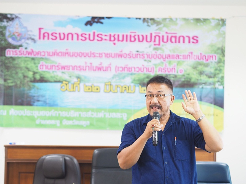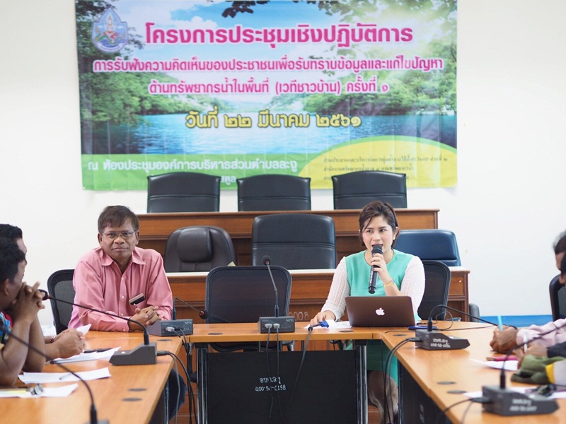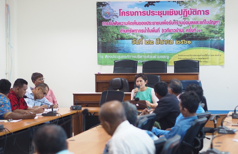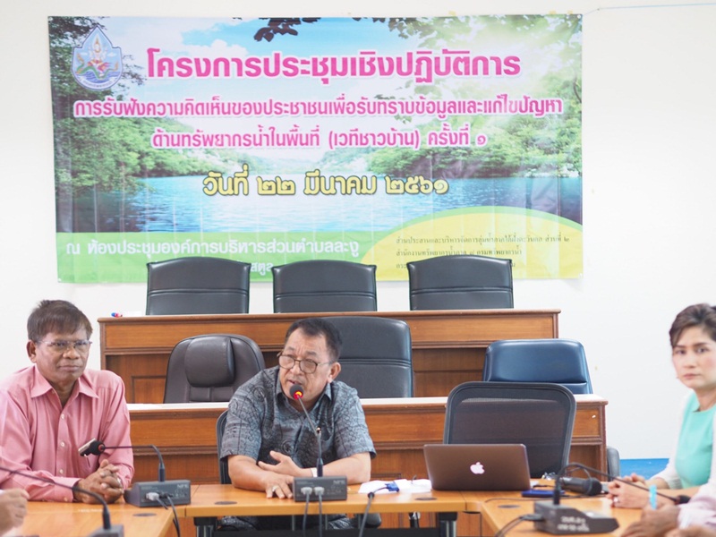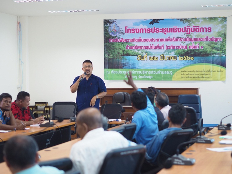 เมื่อวันที่ 22 มีนาคม 2561 นายไกรสร เพ็งสกุล ผู้อำนวยการสำนักงานทรัพยากรน้ำภาค 8 มอบหมายให้ นายชำนาญ ชูแก้ว พร้อมเจ้าหน้าที่ ส่วนประสานและบริหารจัดการลุ่มน้ำภาคใต้ฝั่งตะวันตกส่วนที่ 2 จัดโครงการประชุมเชิงปฏิบัติการการรับฟังความคิดเห็นของประชาชนเพื่อรับทราบข้อมูลและแก้ไขปัญหาด้านทรัพยากรน้ำในพื้นที่ (เวทีชาวบ้าน) ครั้งที่ 1 โดยนายจำรัส ฮ่องสาย นายกองค์การบริหารส่วนตำบลละงู เป็นประธานเปิดโครงการ และเข้าร่วมโครงการ ณ ห้องประชุมองค์การบริหารส่วนตำบลละงู อำเภอละงู จังหวัดสตูล ผู้เข้าร่วมโครงการฯ ประกอบด้วย คณะทำงานลุ่มน้ำสาขา ประชาชนผู้มีส่วนได้ส่วนเสีย ภาคราชการ ภาคเอกชน องค์กรปกครองส่วนท้องถิ่น จำนวน 70 คน โดยมีวัตถุประสงค์เพื่อ รับทราบปัญหาและความต้องการในการบริหารจัดการทรัพยากรน้ำ เปิดโอกาสให้มีการแลกเปลี่ยนข้อมูลข่าวสาร ประสบการณ์ สภาพปัญหาของแต่ละพื้นที่ และหาแนวทางแก้ไขปัญหาโดยกระบวนการมีส่วนร่วมของประชาชน วิธีการดำเนินการประชุมโดย