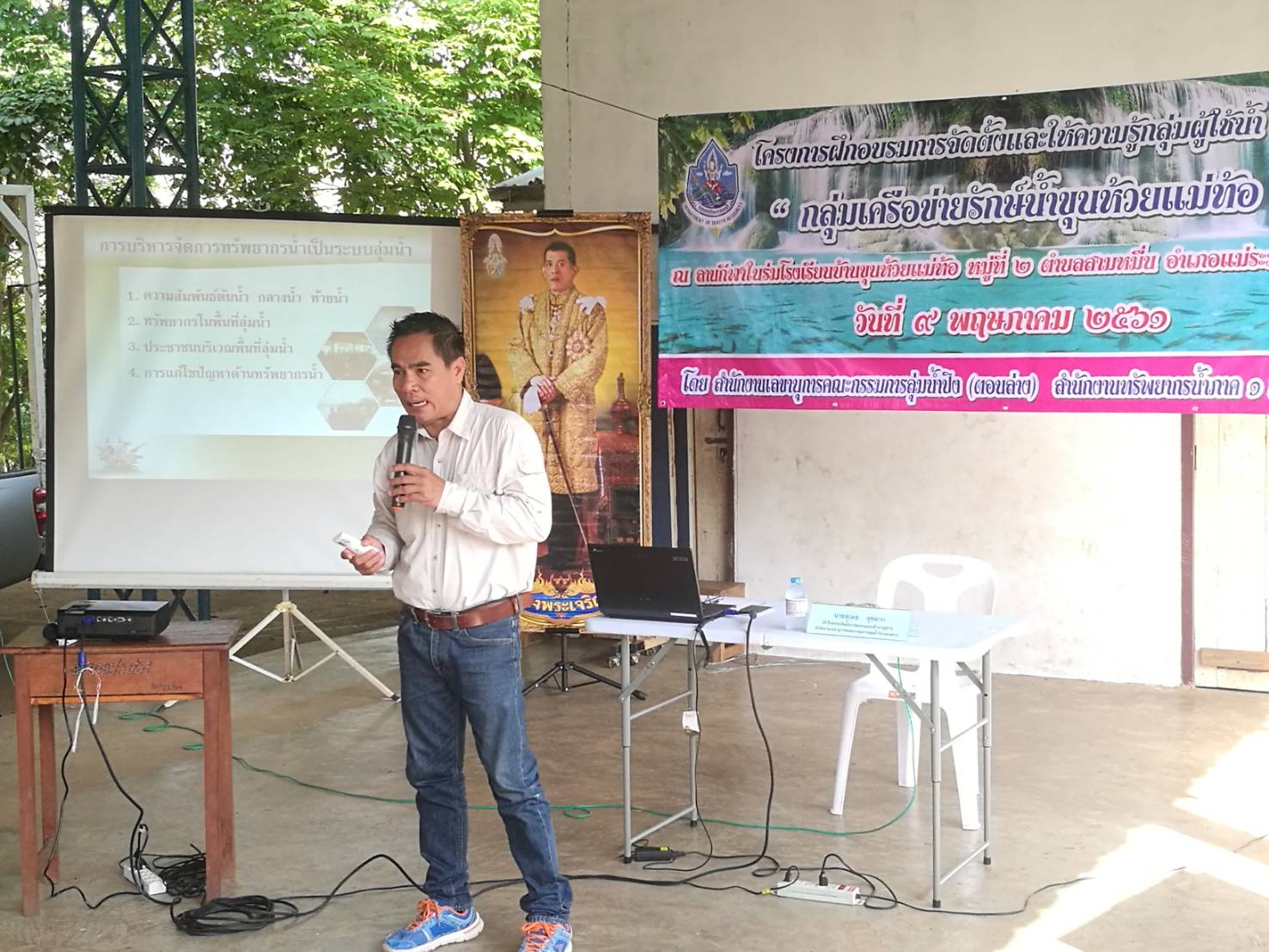 สำนักงานทรัพยากรน้ำภาค 1 โดยส่วนประสานและบริหารจัดการลุ่มน้ำปิงตอนล่า ได้จัดโครงการฝึกอบรมการจัดตั้งและให้ความรู้กลุ่มผู้ใช้น้ำ (เครือข่าย) “กลุ่มเครือข่ายรักษ์น้ำขุนห้วยแม่ท้อ” ณ ลานกีฬาในร่มโรงเรียนบ้านขุนห้วยแม่ท้อ หมู่ 2 ต.สามหมื่น อ.แม่ระมาด จ.ตาก โดยมี นายสิทธิชัย ตะวันอรุณ ผู้ใหญ่บ้านหมู่ที่ 2 ต.สามหมื่น ให้เกียรติเป็นประธานในพิธีเปิด มีนายราชันย์ หนองเอี่ยน วิศวกรโยธาชำนาญการ กล่าวรายงาน มีผู้เข้าร่วมประชุมจำนวน 94 คน โดยมีวัตถุประสงค์เพื่อจัดตั้งเครือข่ายการบริหารจัดการทรัพยากรน้ำในพื้นที่ลุ่มน้ำสาขา ซึ่งได้มีการบรรยายให้ความรู้ ความเข้าใจและร่วมกันกำหนดกฎ กติกา ในการบริหารจัดการทรัพยากรน้ำในพื้นที่ของตนเอง ได้อย่างมีประสิทธิภาพและเกิดประโยชน์สูงสุด ตลอดจนให้กลุ่มผู้ใช้น้ำมีบทบาทและมีส่วนร่วมในการดูแลรักษา ทรัพยากรน้ำในพื้นที่โดยทำกิจกรรมสร้างฝายชะลอน้ำแบบกระสอบทราย จำนวน 1 แห่ง