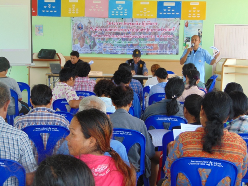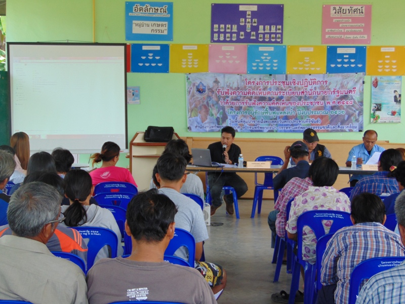 สำนักงานทรัพยากรน้ำภาค ๗ โดยส่วนประสานและบริหารจัดการลุ่มน้ำเพชรบุรีและประจวบคีรีขันธ์ จัดประชุมเชิงปฏิบัติการรับฟังความคิดเห็นตามระเบียบสำนักนายกรัฐมนตรี ว่าด้วยการรับฟังความคิดเห็นของประชาชน พ.ศ. ๒๕๔๘ โครงการอนุรักษ์ฟื้นฟูแหล่งน้ำ ประจำปีงบประมาณ ๒๕๖๒ โครงการอนุรักษ์ฟื้นฟูทางน้ำห้วยร่อนแก่น บ้านหนองไทร หมู่ที่ ๖ ตำบลไร่เก่า อำเภอสามร้อยยอด จังหวัดประจวบคีรีขันธ์ ณ ศาลากลางหมู่บ้านหนองไทร หมู่ที่ ๖ ตำบลไร่เก่า อำเภอสามร้อยยอด จังหวัดประจวบคีรีขันธ์ วันอังคารที่ ๘ พฤษภาคม ๒๕๖๑ เวลา ๑๓.๐๐ น. โดย นายเชตุ จันทร์ถิ นักวิเคราะห์นโยบายและแผนชำนาญการ ชี้แจงเหตุผลความจำเป็นและวัตถุประสงค์ของการรับฟังความคิดเห็นของประชาชนตามระเบียบสำนักนายกรัฐมนตรีฯ และนายภัทรพงศ์ คชรัตน์ วิศวกรโยธาปฏิบัติการ ชี้แจงรายละเอียดโครงการ ผู้เข้าร่วมการประชุม จำนวน ๗๖ คน ที่ประชุมมีมติเห็นชอบให้ดำเนินโครงการ