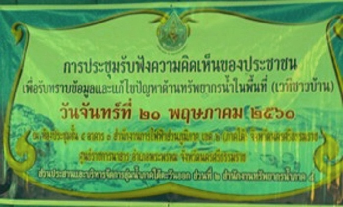 วันที่ 21 พฤษภาคม 2561 สำนักงานทรัพยากรน้ำภาค 8 มอบหมายให้ นายโสภณ สัสดีอำไพ ผู้อำนวยการส่วนประสานและบริหารจัดการลุ่มน้ำภาคใต้ตะวันออก พร้อมเจ้าหน้าที่ดำเนินการจัดประชุมโครงการ รับฟังความคิดเห็นของประชาชนเพื่อรับทราบข้อมูลและแก้ไขปัญหาด้านทรัพยากรน้ำในพื้นที่ (เวทีชาวบ้าน) ณ ห้องประชุมชั้น 4 อาคาร 3 สำนักงานการไฟฟ้าส่วนภูมิภาคเขต 2 (ภาคใต้) อำเภอพระพรหม จังหวัดนครศรีธรรมราช มีผู้เข้าร่วมประชุมประกอบด้วย องค์กรลุ่มน้ำ เจ้าหน้าที่ส่วนราชการ ผู้แทนองค์กรปกครองส่วนท้องถิ่น ประชาชนผู้มีส่วนได้ส่วนเสียในพื้นที่ลุ่มน้ำคลองท่าดี ลุ่มน้ำสาขาคลองเสาธง และผู้สังเกตการณ์ รวมจำนวน 70 คน ทั้งนี้มีวัตถุประสงค์เพื่อรับทราบปัญหาและความต้องการในการบริหารจัดการทรัพยากรน้ำและทรัพยากรอื่น ๆ ที่เกี่ยวข้อง ที่เกิดขึ้นในพื้นที่ลุ่มน้ำสาขา และหาแนวทางแก้ไขปัญหาการบริหารจัดการทรัพยากรน้ำ โดยกระบวนการมีส่วนร่วมของประชาชนและผู้มีส่วนได้ส่วนเสียในพื้นที่ อีกทั้ง เป็นเวทีเปิดโอกาสให้มีการแลกเปลี่ยนข้อมูลข่าวสาร ประสบการณ์ เพื่อหาแนวทางป้องกัน และแก้ไขปัญหาที่เกิดขึ้นในลุ่มน้ำ อีกด้วย