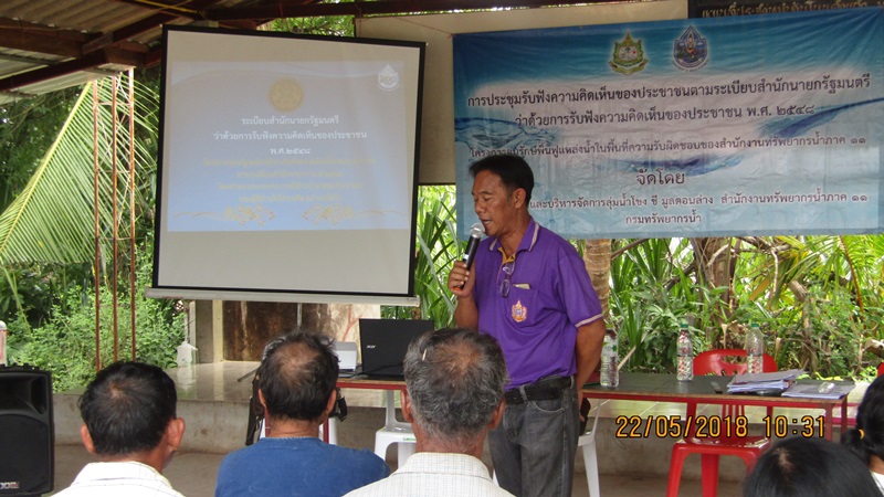 วันที่ ๒๒ พฤษภาคม ๒๕๖๑ สำนักงานทรัพยากรน้ำภาค ๑๑ ส่วนประสานและบริหารจัดการลุ่มน้ำโขง ชี มูล ตอนล่าง จัดรับฟังความคิดเห็นของประชาชน ตามระเบียบสำนักนายกรัฐมนตรี พ.ศ.๒๕๔๘ ประจำปีงบประมาณ ๒๕๖๒ โครงการปรับปรุงฟื้นฟูแหล่งน้ำลำหนองชาติ ณ ศาลากลางบ้าน บ้านโนนคำแก้ว หมู่ที่ ๘ ตำบลไพบูลย์ อำเภอน้ำขุ่น จังหวัดอุบลราชธานี