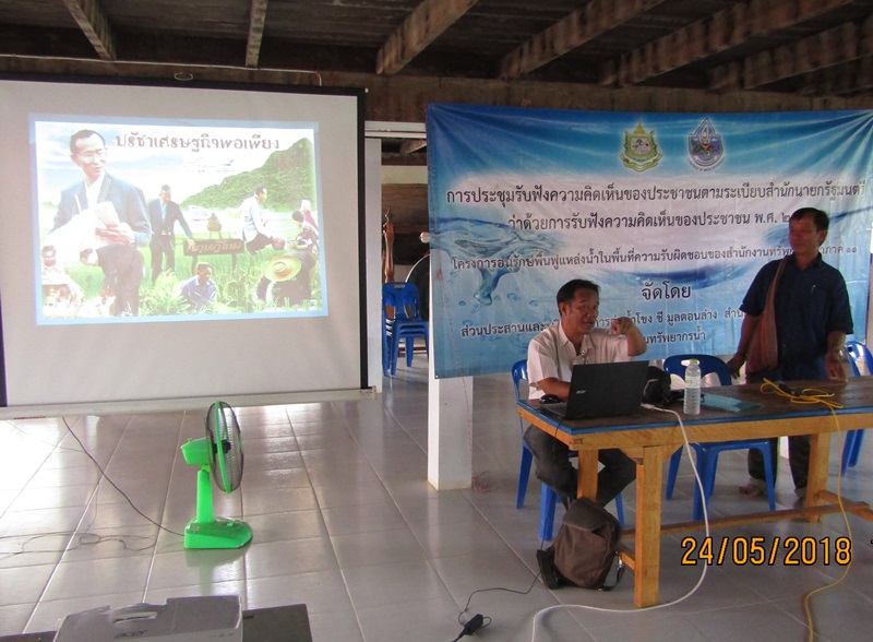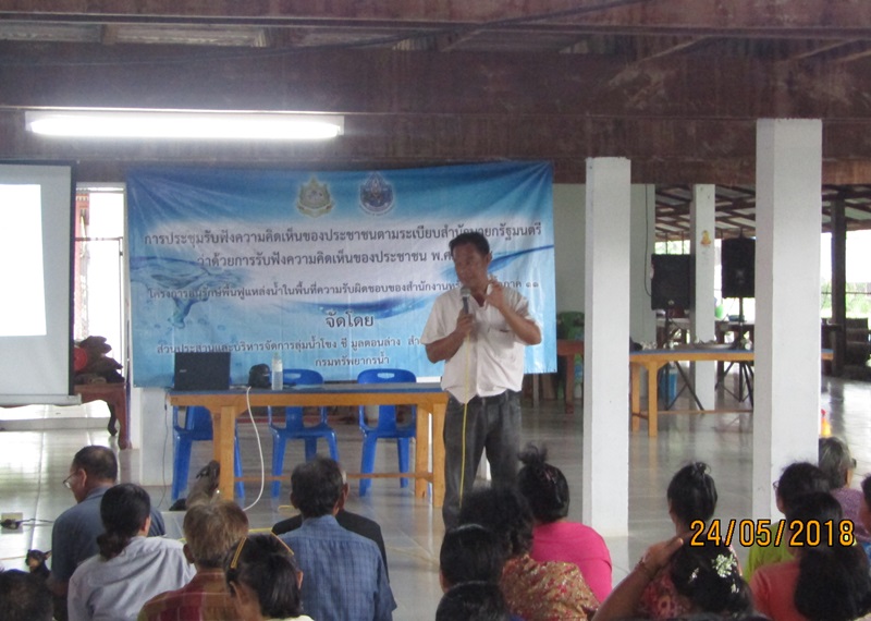 วันที่ 24 พฤษภาคม 2561 สำนักงานทรัพยากรน้ำภาค 11 ส่วนประสานและบริหารจัดการลุ่มน้ำโขง ชี มูล ตอนล่าง จัดรับฟังความคิดเห็นของประชาชน ตามระเบียบสำนักนายกรัฐมนตรี พ.ศ.2548 ประจำปีงบประมาณ 2562 โครงการปรับปรุงฟื้นฟูแหล่งน้ำอ่างเก็บน้ำห้วยปูน ณ ศาลาวัดบ้านป่าก้าว บ้านป่าก้าว หมู่ที่ 4,8 ตำบลโนนสมบูรณ์ อำเภอนาจะหลวย จังหวัดอุบลราชธานี