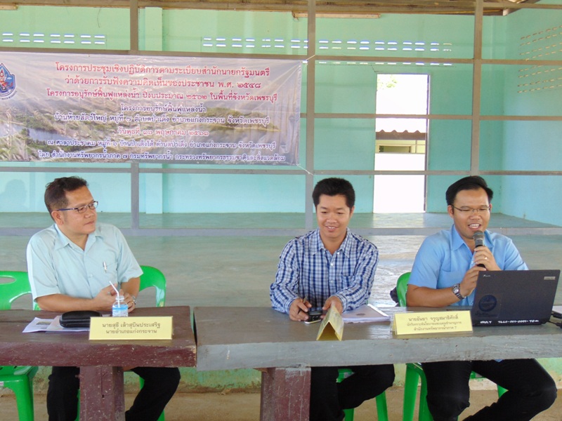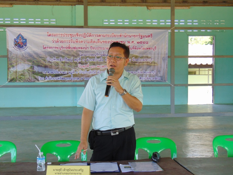 สำนักงานทรัพยากรน้ำภาค ๗ โดยส่วนประสานและบริหารจัดการลุ่มน้ำเพชรบุรีและประจวบคีรีขันธ์และส่วนพัฒนาและฟื้นฟูแหล่งน้ำ จัดโครงการประชุมเชิงปฏิบัติการตามระเบียบสำนักนายกรัฐมนตรี ว่าด้วยการรับฟังความคิดเห็นของประชาชน พ.ศ. ๒๕๔๘ ปีงบประมาณ ๒๕๖๒ โครงการอนุรักษ์ฟื้นฟูแหล่งน้ำ บ้านห้วยสัตว์ใหญ่ หมู่ที่ ๗ ตำบลป่าเด็ง อำเภอแก่งกระจาน จังหวัดเพชรบุรี ในวันพุธที่ ๑๖ พฤษภาคม ๒๕๖๑ เวลา ๐๙.๐๐ - ๑๒.๐๐ น. ณ ศาลาประชาคม หมู่ที่ ๖ บ้านป่าเด็งใต้ ตำบลป่าเด็ง อำเภอแก่งกระจาน จังหวัดเพชรบุรี โดยมี นายสุธี เล้าสุบินประเสริฐ นายอำเภอแก่งกระจาน เปิดการประชุมและมอบนโยบายการบริหารจัดการน้ำ นายธันยา จรูญสมาธิศักดิ์ นักวิเคราะห์นโยบายและแผนชำนาญการ สำนักงานทรัพยากรน้ำภาค ๗ ชี้แจงวัตถุประสงค์โครงการประชุมเชิงปฏิบัติการตามระเบียบสำนักนายกรัฐมนตรีฯ นายเขมชาติ ปลาทอง วิศวกรโยธาปฏิบัติการ สำนักงานทรัพยากรน้ำภาค ๗ ชี้แจงรายละเอียดการดำเนินโครงการฯ และตอบข้อซักถาม ที่ประชุมมีมติเห็นชอบให้ดำเนินการโครงการอนุรักษ์ฟื้นฟูแหล่งน้ำ บ้านห้วยสัตว์ใหญ่ หมู่ที่ ๗ ตำบลป่าเด็ง อำเภอแก่งกระจาน จังหวัดเพชรบุรี ผู้เข้าร่วมประชุมประกอบด้วย ประชาชนในพื้นที่ ผู้นำชุมชน หน่วยงานราชการที่เกี่ยวข้อง จำนวน ๓๘ คน และเจ้าหน้าที่ จำนวน ๗ คน รวมทั้งสิ้น ๔๕ คน