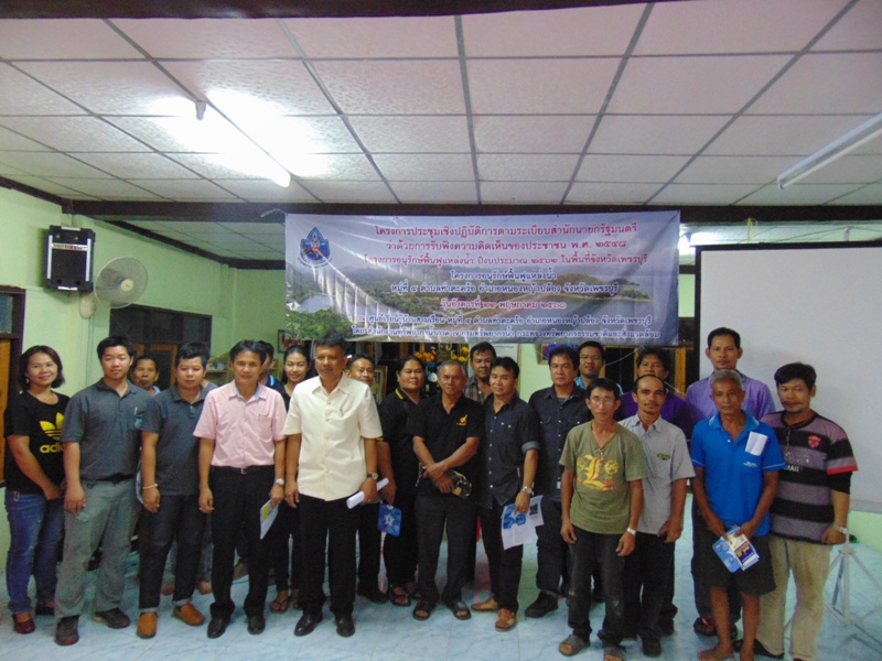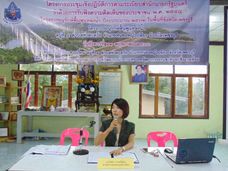 สำนักงานทรัพยากรน้ำภาค ๗ โดยส่วนประสานและบริหารจัดการลุ่มน้ำเพชรบุรีและประจวบคีรีขันธ์และส่วนพัฒนาและฟื้นฟูแหล่งน้ำ จัดโครงการประชุมเชิงปฏิบัติการตามระเบียบสำนักนายกรัฐมนตรี ว่าด้วยการรับฟังความคิดเห็นของประชาชน พ.ศ. ๒๕๔๘ ปีงบประมาณ ๒๕๖๒ โครงการอนุรักษ์ฟื้นฟูแหล่งน้ำ หมู่ที่ ๔ ตำบลท่าตะคร้อ อำเภอหนองหญ้าปล้อง จังหวัดเพชรบุรี ในวันอังคารที่ ๒๒ พฤษภาคม ๒๕๖๑ เวลา ๑๗.๐๐ – ๒๐.๐๐ น. ณ ศูนย์เรียนรู้บ้านสามเรือน หมู่ที่ ๔ ตำบลท่าตะคร้อ อำเภอหนองหญ้าปล้อง จังหวัดเพชรบุรี โดยมี นางวิพร แววศรีผ่อง นายอำเภอหนองหญ้าปล้อง เปิดการประชุมและมอบนโยบายการบริหารจัดการน้ำ นายธันยา จรูญสมาธิศักดิ์ นักวิเคราะห์นโยบายและแผนชำนาญการ สำนักงานทรัพยากรน้ำภาค ๗ ชี้แจงวัตถุประสงค์โครงการประชุมเชิงปฏิบัติการตามระเบียบสำนักนายกรัฐมนตรีฯ นายเขมชาติ ปลาทอง วิศวกรโยธาปฏิบัติการ สำนักงานทรัพยากรน้ำภาค ๗ ชี้แจงรายละเอียดการดำเนินโครงการฯ และตอบข้อซักถาม ที่ประชุมมีมติเห็นชอบให้ดำเนินการโครงการอนุรักษ์ฟื้นฟูแหล่งน้ำ หมู่ที่ ๔ ตำบลท่าตะคร้อ อำเภอหนองหญ้าปล้อง จังหวัดเพชรบุรี ผู้เข้าร่วมประชุมประกอบด้วย ประชาชนในพื้นที่ ผู้นำชุมชน หน่วยงานราชการที่เกี่ยวข้อง จำนวน ๓๒ คน และเจ้าหน้าที่ จำนวน ๗ คน รวมทั้งสิ้น ๓๙ คน