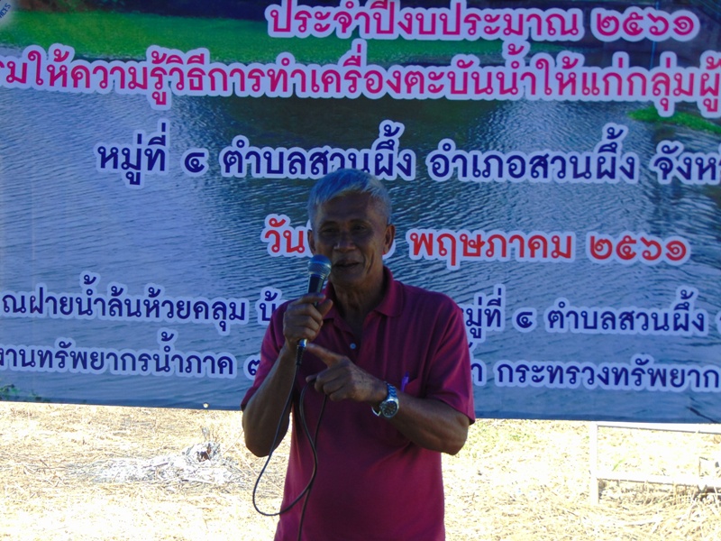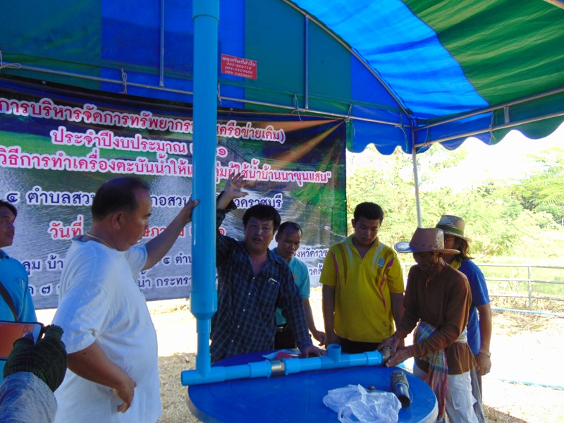 กิจกรรมในครั้งนี้ เกิดจากความต้องการของคณะกรรมการกลุ่มผู้ใช้น้ำบ้านนาขุนแสน เพื่อให้สมาชิกกลุ่มผู้ใช้น้ำฯ ซึ่งส่วนใหญ่ประกอบอาชีพการเกษตร ได้มีความรู้ทักษะการทำเครื่องตะบันน้ำ สามารถพัฒนาต่อยอดนำวัสดุที่เหลือใช้ในครัวเรือนมาประยุกต์ทำเครื่องตะบันน้ำใช้ในครัวเรือนและใช้ทำการเกษตรได้ โดยมี นายธวัชชัย วรรณโภคิน ผู้มีความรู้ภูมิปัญญาและประสบการณ์การทำเครื่องตะบันน้ำ มาถ่ายทอดองค์ความรู้พร้อมฝึกปฏิบัติวิธีการทำเครื่องตะบันน้ำ ผู้เข้าร่วมโครงการฯ ประกอบด้วย สมาชิกกลุ่มผู้ใช้น้ำ ผู้นำในพื้นที่ ผู้สนใจจากพื้นที่ใกล้เคียง และผู้ร่วมสังเกตการณ์ รวมประมาณ ๕๐ คน
