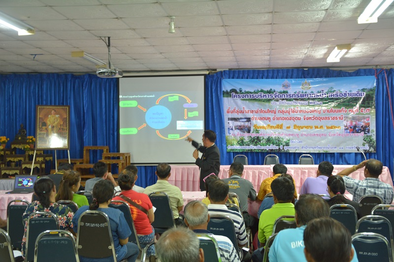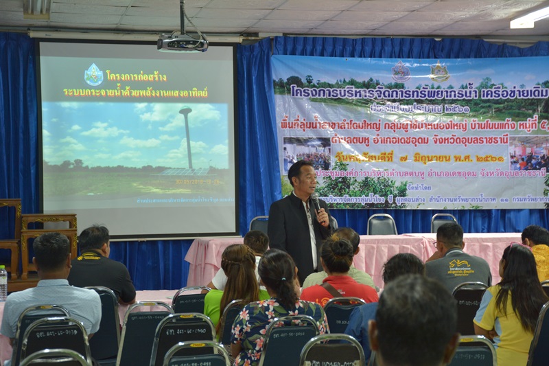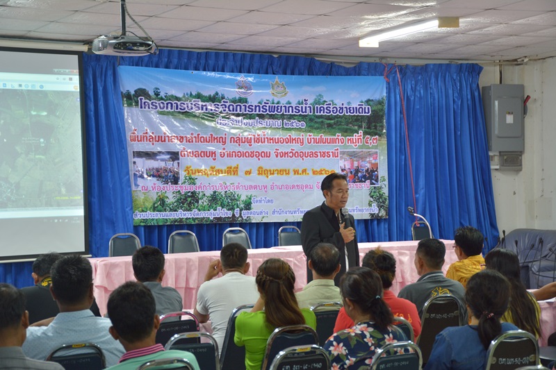 วันที่ 7 มิถุนายน 2561 สำนักงานทรัพยากรน้ำภาค 11 โดยส่วนประสานและบริหารจัดการลุ่มน้ำโขง ชี มูลตอนล่าง จัดโครงการบริหารจัดการทรัพยากรน้ำ (เครือข่ายเดิม) ปีงบประมาณ 2561 พื้นที่ลุ่มน้ำสาขาลำโดมใหญ่ กลุ่มผู้ใช้น้ำหนองใหญ่ บ้านโนนแก้ง หมู่ที่ 5,7 ตำบลตบหู อำเภอเดชอุดม จังหวัดอุบลราชธานี ณ ห้องประชุมองค์การบริหารส่วนตำบลตบหู อำเภอเดชอุดม จังหวัดอุบลราชธานี มีผู้เข้าร่วมรับการอบรม จำนวน 60 คน