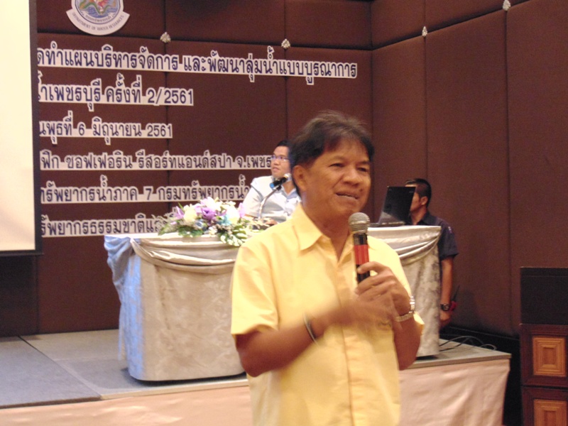 สำนักงานทรัพยากรน้ำภาค ๗ โดยส่วนประสานและบริหารจัดการลุ่มน้ำเพชรบุรีและประจวบคีรีขันธ์ ได้ดำเนินการจัดโครงการประชุมเชิงปฏิบัติการเพื่อจัดทำแผนบริหารจัดการและพัฒนาลุ่มน้ำแบบบูรณาการลุ่มน้ำเพชรบุรี ครั้งที่ ๒/๒๕๖๑ วันพุธที่ ๖ มิถุนายน ๒๕๖๑ ณ ห้องเพชรชมพู โรงแรมแกรนด์ แปซิฟิก ซอฟเฟอรีน รีสอร์ทแอนด์สปา อำเภอชะอำ จังหวัดเพชรบุรี โดยมี นายทรงรัฐ รัฐปัตย์ นายอำเภอชะอำ เป็นประธานเปิดโครงการ นางสาวธนินี เขียวอยู่ นักวิเคราะห์นโยบายและแผนชำนาญการ ส่วนประสานและบริหารจัดการลุ่มน้ำเพชรบุรีและประจวบคีรีขันธ์ กล่าวรายงาน มีวิทยากรจากสำนักงานทรัพยากรน้ำภาค ๗ นายธันยา จรูญสมาธิศักดิ์ นักวิเคราะห์นโยบายและแผนชำนาญการ บรรยายเรื่อง พื้นที่วิกฤตน้ำ (Area Based) กับการบริหารจัดการน้ำในระบบลุ่มน้ำ นายมนตรี โภโค นายช่างโยธาชำนาญงาน บรรยายเรื่องข้อมูลเป้าหมายเชิงพื้นที่ของลุ่มน้ำเพชรบุรี และเจ้าหน้าที่จากสำนักงานทรัพยากรน้ำภาค ๗ เป็นวิทยากร พิจารณาเป้าหมายเชิงพื้นที่และการดำเนินงานตามแผนความต้องการเร่งด่วน ผู้เข้าร่วมโครงการประกอบด้วย ผู้แทนนายอำเภอ ผู้แทนจากองค์กรปกครองส่วนท้องถิ่น ส่วนราชการ และเจ้าหน้าที่ที่เกี่ยวข้อง รวมผู้เข้าร่วมโครงการทั้งสิ้นจำนวน ๖๕ คน