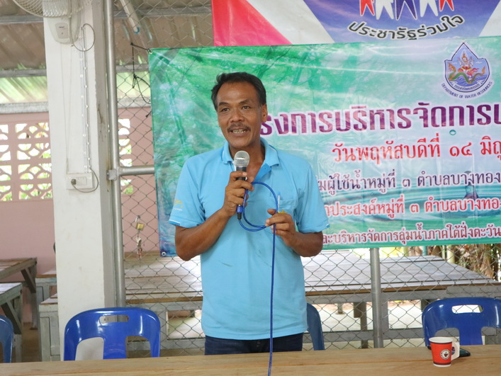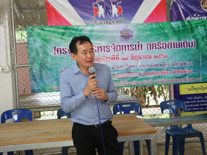 เมื่อวันที่ 14 มิถุนายน พ.ศ. 2561 นายสาธิต รัตนสิงห์ ผู้อำนวยการสำนักงานทรัพยากรน้ำภาค 10 มอบหมายให้ส่วนประสานและบริหารจัดการลุ่มน้ำภาคใต้ฝั่งตะวันตก ส่วนที่ 1 จัดโครงการบริหารจัดการน้ำ (เครือข่ายเดิม) เครือข่ายกลุ่มผู้ใช้น้ำหมู่ที่ 3 ตำบลบางทอง อำเภอท้ายเหมือง จังหวัดพังงา ณ ศาลาอเนกประสงค์หมู่ที่ 3 ตำบลบางทอง อำเภอท้ายเหมือง จังหวัดพังงา ได้รับความร่วมมือจากกลุ่มเครือข่ายฯ เข้าร่วมกิจกรรม จำนวน 68 คน โดยมีวัตถุประสงค์ เพื่อสนับสนุนกลุ่มเครือข่ายให้มีการบริหารจัดการทรัพยากรน้ำ รวมทั้งเพิ่มความเข้มแข็งของกลุ่มเครือข่าย และเพื่อสนับสนุนกิจกรรมการดำเนินงานของกลุ่มเครือข่ายให้มีการบริการจัดการกลุ่มเครือข่ายอย่างต่อเนื่อง