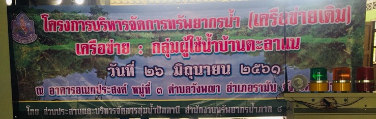 วันที่ 26 มิถุนายน 2561 นายสุทัศน์ นุ้ยเล็ก ผู้อำนวยการส่วนพัฒนาและฟื้นฟูแหล่งน้ำ รักษาราชการแทน ผู้อำนวยการสำนักงานทรัพยากรน้ำภาค 8 มอบหมายให้ส่วนประสานและบริหารจัดการลุ่มน้ำปัตตานี จัดโครงการบริหารจัดการทรัพยากรน้ำ เครือข่ายกลุ่มผู้ใช้น้ำบ้านตะลาแน ณ อาคารอเนกประสงค์ หมู่ที่ 3 ต.วังพญา อ.รามัน จ.ยะลา ผู้เข้าร่วมประชุมประกอบด้วย กลุ่มผู้ใช้น้ำบ้านตะลาแน จำนวน 60 คน โดยมีวัตถุประสงค์เพื่อสนับสนุนกลุ่มเครือข่ายให้มีการบริหารจัดการทรัพยากรน้ำ รวมทั้งเพิ่มความเข้มแข็ง และเพิ่มศักยภาพของกลุ่มเครือข่ายให้มีความสามารถในการบริหารจัดการทรัพยากรน้ำในพื้นที่อย่างมีประสิทธิภาพ และสนับสนุนกิจกรรมการดำเนินงานของกลุ่มเครือข่ายให้มีการบริหารจัดการกลุ่มเครือข่ายอย่างต่อเนื่อง