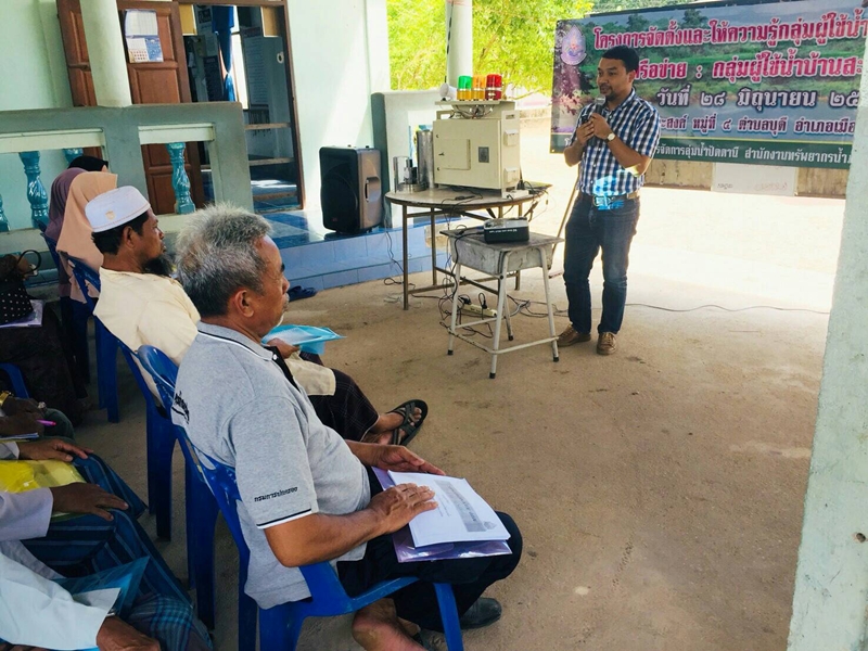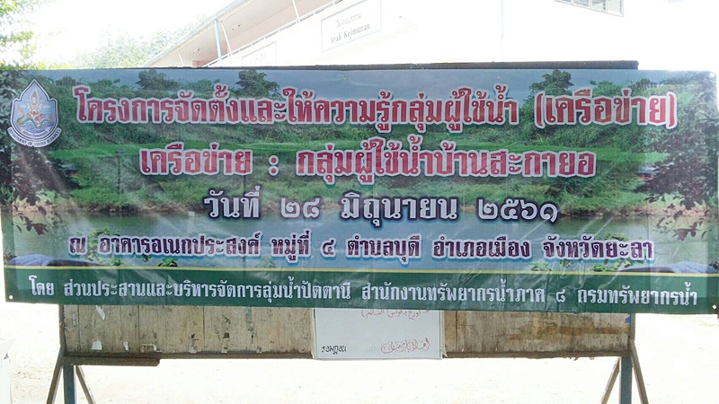 วันที่ 28 มิถุนายน 2561 นายสุทัศน์ นุ้ยเล็ก ผู้อำนวยการส่วนพัฒนาและฟื้นฟูแหล่งน้ำ รักษาราชการแทนผู้อำนวยการสำนักงานทรัพยากรน้ำภาค 8 มอบหมายให้ส่วนประสานและบริหารจัดการลุ่มน้ำปัตตานี จัดโครงการบริหารจัดการทรัพยากรน้ำ เครือข่ายกลุ่มผู้ใช้น้ำบ้านสะกายอ ณ อาคารอเนกประสงค์ หมู่ที่ 4 ต.บุดี อ.รามัน จ.ยะลา ผู้เข้าร่วมประชุมประกอบด้วยกลุ่มผู้ใช้น้ำบ้านสะกายอ จำนวน 60 คน โดยมีวัตถุประสงค์เพื่อสนับสนุนกลุ่มเครือข่ายให้มีการบริหารจัดการทรัพยากรน้ำ รวมทั้งเพิ่มความเข้มแข็ง และเพิ่มศักยภาพของกลุ่มเครือข่ายให้มีความสามารถในการบริหารจัดการทรัพยากรน้ำในพื้นที่อย่างมีประสิทธิภาพ และสนับสนุนกิจกรรมดำเนินงานของกลุ่มเครือข่ายให้มีการบริหารจัดการกลุ่มเครือข่ายอย่างต่อเนื่อง