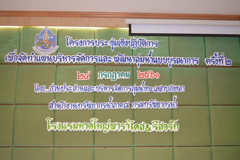 วันที่ 24 กรกฎาคม 2561 นายสุทัศน์ นุ้ยเล็ก ผู้อำนวยการส่วนพัฒนาและฟื้นฟูแหล่งน้ำ รักษาราชการแทน ผู้อำนวยการสำนักงานทรัพยากรน้ำภาค 8 มอบหมายให้นายสัมพันธ์ ดุลยาภรณ์ ผู้อำนวยการส่วนประสานและบริหารจัดการลุ่มน้ำทะเลสาบสงขลา พร้อมเจ้าหน้าที่ จัดโครงการประชุมเชิงปฏิบัติการเพื่อจัดทำแผนบริหารจัดการและพัฒนาลุ่มน้ำแบบบูรณาการ ณ โรงแรมหาดใหญ่พาราไดส แอนด์ รีสอร์ท อ.หาดใหญ่ จ.สงขลา โดยมีการบรรยายในหัวข้อวิชา วิเคราะห์เป้าหมายจำแนกตามยุทธศาสตร์รายกลุ่มลุ่มน้ำทะเลสาบสงขลา , ขั้นตอนในการจัดทำแผนงาน/โครงการ การบริหารจัดการทรัพยากรน้ำแบบบูรณาการในลุ่มน้ำทะเลสาบสงขลา (แผนปฏิบัติการปี 2563) โดยนายสัมพันธ์ ดุลยาภรณ์ ผู้อำนวยการส่วนประสานและบริหารจัดการลุ่มน้ำทะเลสาบสงขลา และแบ่งกลุ่มระดมความคิดพิจารณาแผนบริหารจัดการน้ำในลุ่มน้ำให้เชื่อมโยงกับแผนบูรณาการน้ำ และแผนบูรณาการภาค และจัดทำร่างแผนปฏิบัติการปี 2563 โดยเจ้าหน้าที่ส่วนประสานและบริหารจัดการลุ่มน้ำทะเลสาบสงขลา