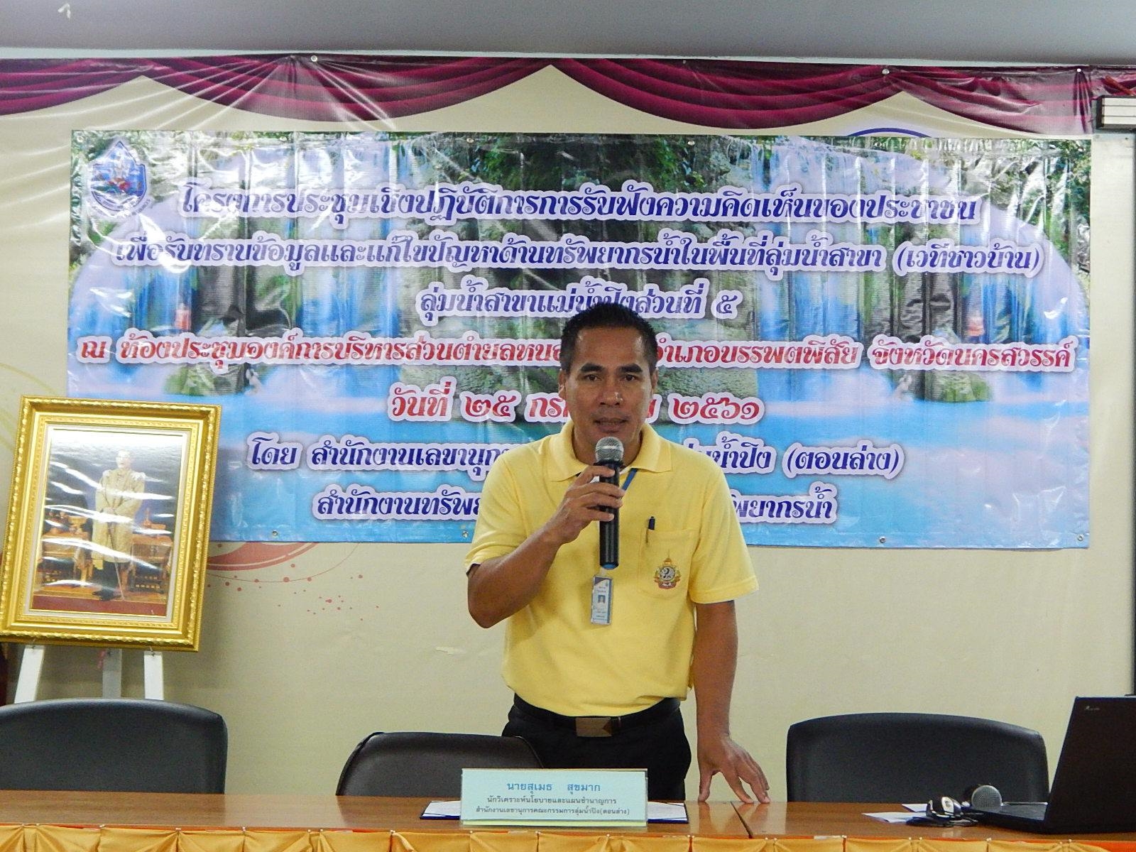 สำนักงานทรัพยากรน้ำภาค 1 โดยส่วนประสานและบริหารจัดการลุ่มน้ำปิงตอนล่างได้จัดประชุมเชิงปฏิบัติการรับฟังความคิดเห็นของประชาชน เพื่อรับทราบข้อมูลและแก้ไขปัญหาด้านทรัพยากรน้ำ ในพื้นที่ลุ่มน้ำสาขาแม่น้ำปิงส่วนที่ 5 (เวทีชาวบ้าน) ประจำปี 2561 วันที่ 25 กรกฎาคม 2561 ณ ห้องประชุมองค์การบริหารส่วนตำบลหนองกรด อ.บรรพตพิสัย จ.นครสวรรค์ โดยได้รับเกียรติจาก นายอัมพร ศรีเดช รองนายกองค์การบริหารส่วนตำบลหนองกรด เป็นประธานในพิธี มีผู้เข้าร่วมประชุม จำนวน 71 คน การประชุมครั้งนี้มีวัตถุประสงค์ เพื่อให้ผู้เข้าร่วมประชุม ได้มีส่วนร่วมในการร่วมคิด ร่วมตัดสินใจ และร่วมเสนอแนะประเด็นสภาพปัญหาเชิงพื้นที่ และแนวทางการแก้ไข เพื่อให้ได้มาซึ่งแผนงานโครงการ ที่จะสามารถแก้ไขปัญหาด้านต่างๆ ให้สอดคล้องกับยุทธศาสตร์การบริหารจัดการทรัพยากรน้ำ ทั้ง 6 ด้าน และตรงกับความต้องการของพื้นที่ ได้อย่างมีประสิทธิภาพ และยั่งยืน พร้อมทั้งได้ทำการประชาสัมพันธ์โครงการก่อสร้างระบบกระจายน้ำด้วยพลังงานแสงอาทิตย์