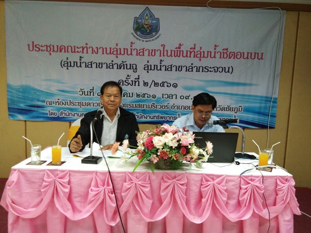 วันที่ ๘ สิงหาคม ๒๕๖๑ นายสาธิต สื่อประเสริฐสุข ผู้อำนวยการสำนักงานทรัพยากรน้ำภาค ๔ ได้มอบหมายให้ส่วนประสานและบริหารจัดการลุ่มน้ำชีตอนบน สำนักงานทรัพยากรน้ำภาค ๔ จัดประชุมคณะทำงานลุ่มน้ำสาขาพื้นที่ลุ่มน้ำชีตอนบน (ลุ่มน้ำสาขาลำกระจวน และลุ่มน้ำสาขาลำคันฉู) ครั้งที่ ๒/๒๕๖๑ ณ ห้องประชุมดาวเรือง โรงแรมสยามริเวอร์ อำเภอเมือง จังหวัดชัยภูมิ โดยมีผู้เข้าร่วมประชุม ประกอบด้วย คณะทำงานลุ่มน้ำสาขา องค์กรปกครองส่วนท้องถิ่น และหน่วยงานราชการที่เกี่ยวข้อง จำนวนรวมทั้งสิ้น ๔๓ คน โดยมีวัตถุประสงค์เพื่อพิจารณาแผนงาน/โครงการจากหน่วยงาน (แผน Function) และแผนงาน/โครงการตามความต้องการในพื้นที่ลุ่มน้ำสาขา ที่เสนอเพื่อบรรจุเข้าแผนปฏิบัติการแผนงานบูรณาการบริหารจัดการทรัพยากรน้ำ ประจำปี ๒๕๖๓ ภายใต้แผนยุทธศาสตร์การบริหารจัดการน้ำประเทศ รวมถึงรายงานข้อมูลต่างๆ ที่เกี่ยวข้องให้คณะทำงานลุ่มน้ำสาขารับทราบ