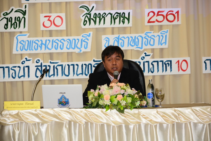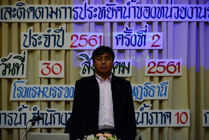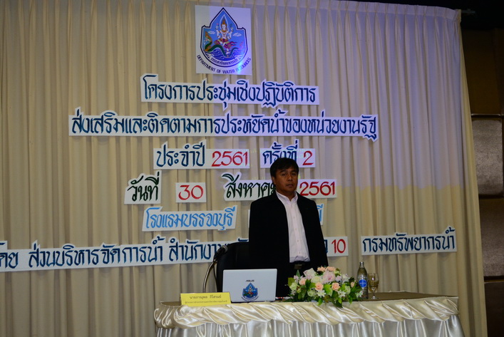 วันนี้ (30 สิงหาคม 2561) นายสาธิต รัตนสิงห์ ผู้อำนวยการสำนักงานทรัพยากรน้ำภาค 10 มอบหมายให้ส่วนบริหารจัดการน้ำ จัดประชุมเชิงปฏิบัติการโครงการส่งเสริมและติดตามการประหยัดน้ำของหน่วยงานภาครัฐ ประจำปี 2561 ครั้งที่ 2 ณ ห้องบรรจงแกรนด์บอลรูม 8 โรงแรมบรรจงบุรี อำเภอเมืองสุราษฎร์ธานี จังหวัดสุราษฎร์ธานี โดยนายภาณุพล ภิโสรมย์ ผู้อำนวยการส่วนประสานและบริหารจัดการลุ่มน้ำตาปี เป็นประธาน ทั้งนี้ เพื่อให้เป็นไปตามมติคณะรัฐมนตรี เมื่อวันที่ 28 กรกฎาคม 2558 ขอความร่วมมือให้หน่วยงานภาครัฐ ลดการใช้น้ำอย่างน้อยร้อยละ 10 เพื่อช่วยบรรเทาปัญหาวิกฤติการขาดแคลนน้ำ การประชุมฯครั้งนี้ เพื่อส่งเสริมการประหยัดน้ำ สร้างจิตสำนึกให้ตระหนักรู้ มีส่วนร่วมการประหยัดน้ำ เสริมสร้างความรู้ความเข้าใจในแนวทางและขั้นตอนการปฏิบัติงานของเจ้าหน้าที่หน่วยงานภาครัฐ และติดตามผลสัมฤทธิ์การปฏิบัติงานของโครงการ