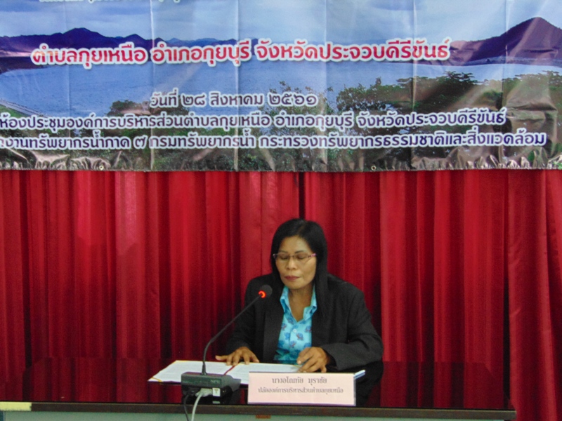 สำนักงานทรัพยากรน้ำภาค ๗ โดยส่วนประสานและบริหารจัดการลุ่มน้ำเพชรบุรีและประจวบคีรีขันธ์ จัดรับฟังความคิดเห็นของประชาชนเพื่อรับทราบข้อมูลและแก้ไขปัญหาด้านทรัพยากรน้ำในพื้นที่ (เวทีชาวบ้าน) วันอังคารที่ ๒๘ สิงหาคม ๒๕๖๑ เวลา ๐๙.๐๐ น. ณ ห้องประชุมองค์การบริหารส่วนตำบลกุยเหนือ อำเภอกุยบุรี จังหวัดประจวบคีรีขันธ์ นางอโณทัย มุราชัย ปลัดองค์การบริหารส่วนตำบลกุยเหนือ เป็นประธานเปิดโครงการ และบรรยายเรื่อง “แนวทางการบริหารจัดการทรัพยากรน้ำในพื้นที่” นางสาวธนินี เขียวอยู่ นักวิเคราะห์นโยบายและแผนชำนาญการ สำนักงานทรัพยากรน้ำภาค ๗ กล่าวรายงาน และวิทยากรกลุ่มจากสำนักงานทรัพยากรน้ำภาค ๗ ทบทวนประเด็นปัญหา สาเหตุ แนวทางการแก้ไขปัญหา และโครงการตามแผนความต้องการด้านทรัพยากรน้ำในพื้นที่ ผู้เข้าร่วมโครงการ จำนวน ๕๖ คน