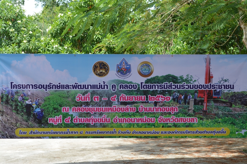วันที่ 3 – 4 กันยายน 2561 นายไกรสร เพ็งสกุล ผู้อำนวยการสำนักงานทรัพยากรน้ำภาค 8 มอบหมายให้นายสัมพันธ์ ดุลยาภรณ์ ผู้อำนวยการส่วนประสานและบริหารจัดการลุ่มน้ำทะเลสาบสงขลา พร้อมเจ้าหน้าที่จัดโครงการอนุรักษ์และพัฒนาแม่น้ำ คู คลอง โดยการมีส่วนร่วมของประชาชน ณ คลองชุมชนเหมืองล่าง บ้านนาทองสุก หมู่ที่ 4 ต.ทุ่งขมิ้น อ.นาหม่อม จ.สงขลา มีกลุ่มเป้าหมายจำนวน 100 คน โดยมีวัตถุประสงค์เพื่อส่งเสริมความร่วมมือระหว่างภาคราชการ องค์กรลุ่มน้ำ องค์กรปกครองส่วนท้องถิ่น ประชาชน เยาวชน จัดทำกิจกรรมอนุรักษ์ และพัฒนาแม่น้ำ คู คลอง ฟื้นฟูและพัฒนาสภาพแวดล้อมของแม่น้ำ คู คลองในพื้นที่ลุ่มน้ำ และสร้างจิตสำนึกให้แก่ภาคราชการ องค์กรลุ่มน้ำและประชาชนผู้มีส่วนได้ส่วนเสีย ในพื้นที่ลุ่มน้ำ ตระหนักในคุณค่าของน้ำ