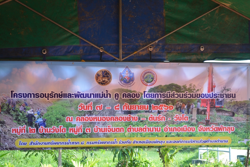 วันที่ 7 – 8 กันยายน 2561 นายไกรสร เพ็งสกุล ผู้อำนวยการสำนักงานทรัพยากรน้ำภาค 8 มอบหมายให้นายสัมพันธ์ ดุลยาภรณ์ ผู้อำนวยการส่วนประสานและบริหารจัดการลุ่มน้ำทะเลสาบสงขลา พร้อมเจ้าหน้าที่จัดโครงการอนุรักษ์และพัฒนาแม่น้ำ คู คลอง โดยการมีส่วนร่วมของประชาชน ณ คลองหนองคลองช้าง – ต้นรัก – วังโด หมู่ที่ 2 บ้านวังโด และหมู่ที่ 3 บ้านเจ็นตก ต.ตำนาน อ.เมือง จ.พัทลุง โดยนางสุมาลี อนันตกานนท์ ปลัดอำเภอเมืองพัทลุง เป็นประธานในพิธี มีผู้เข้าร่วมโครงการจำนวน 110 คน โดยมีวัตถุประสงค์เพื่อส่งเสริมความร่วมมือระหว่างภาคราชการ องค์กรลุ่มน้ำ องค์กรปกครองส่วนท้องถิ่น ประชาชน เยาวชน จัดทำกิจกรรมอนุรักษ์ และพัฒนาแม่น้ำ คู คลอง ฟื้นฟูและพัฒนาสภาพแวดล้อมของแม่น้ำ คู คลองในพื้นที่ลุ่มน้ำ และสร้างจิตสำนึกให้แก่ภาคราชการ องค์กรลุ่มน้ำและประชาชนผู้มีส่วนได้ส่วนเสีย ในพื้นที่ลุ่มน้ำ ตระหนักในคุณค่าของน้ำ