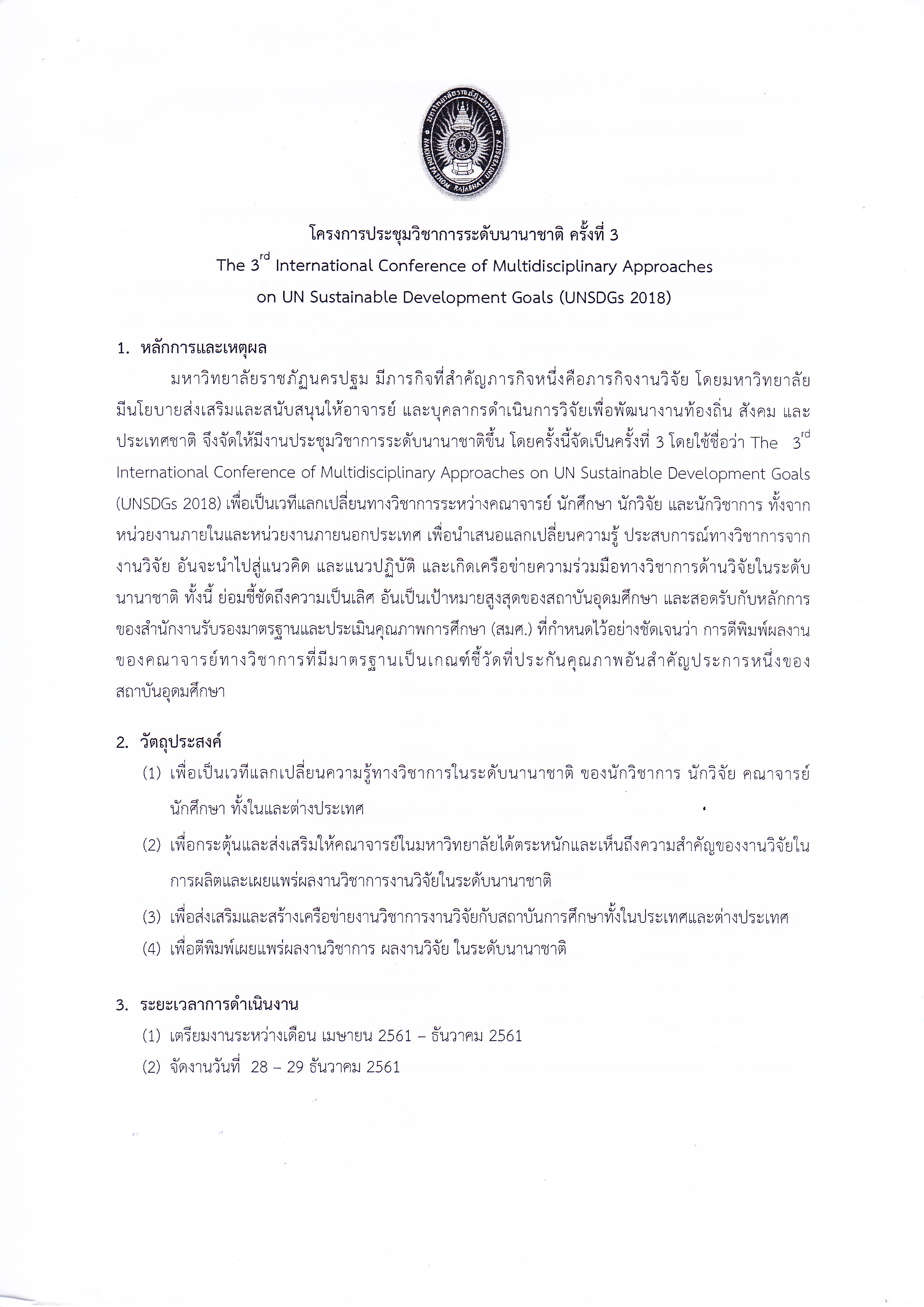 ด้วยมหาวิทยาลัยราชภัฎนครปฐม กำหนดจัดงานประชุมวิชาการระดับนานาชาติ ครั้งที่ 3 (The 3rd International Conference of Multidisciplinary Approaches on UN Sustainable Development Goals) ในระหว่างวันที่ 28 -29 ธันวาคม 2561 ณ โรงแรมวินด์เซอร์ สวีท แอนด์คอนเวนชั่น กรุงเทพมหานคร โดยมีวัตถุประสงค์เพื่อเป็นเวทีในการนำเสนอผลงานทางวิชาการแลกเปลี่ยนนงานวิจัยระหว่างอาจารย์ นักวิชาการ นักวิจัย นักศึกษา และหน่วยงานจากภายในประเทศและต่างประเทศ ได้นำเสนองานวิจัยที่เกี่ยวข้องกับการพัฒนาที่ยั่งยืนตามหลัก UNSDGs