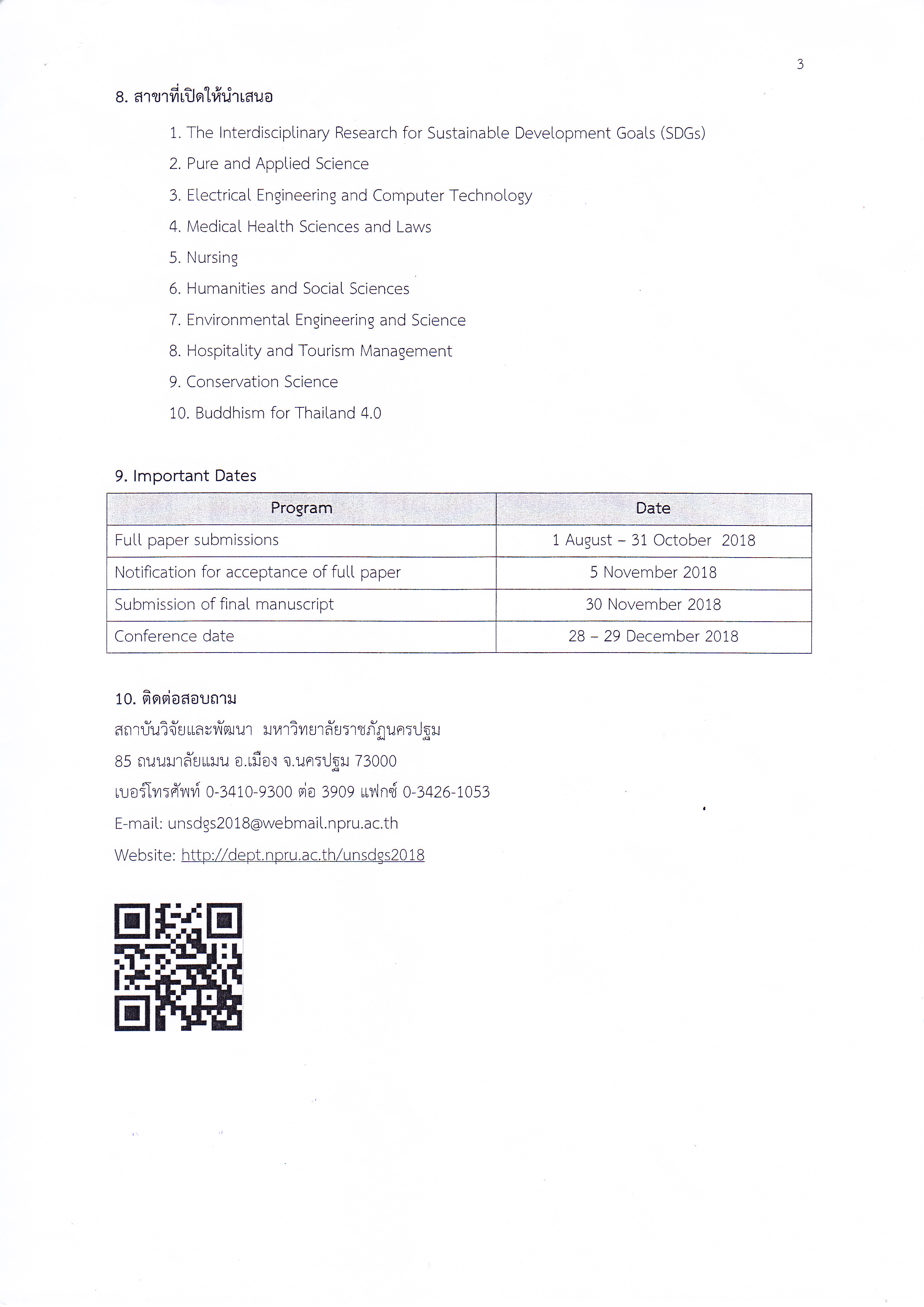 ในการนี้ขอเรียนเชิญผู้สนใจส่งบทความวิจัยเพื่อเข้าร่วมงานประชุมวิชาการฯ โดยสามารถส่งบทความวิจัยฉบับเต็ม (Full Paper) เป็นภาษาอังกฤษ ได้ที่เว็บไซต์ Http:dept.npru.ac.th/unsdgs2018 ตั้งแต่บัดนี้ จนถึงวันที่ 31 ตุลาคม 2561