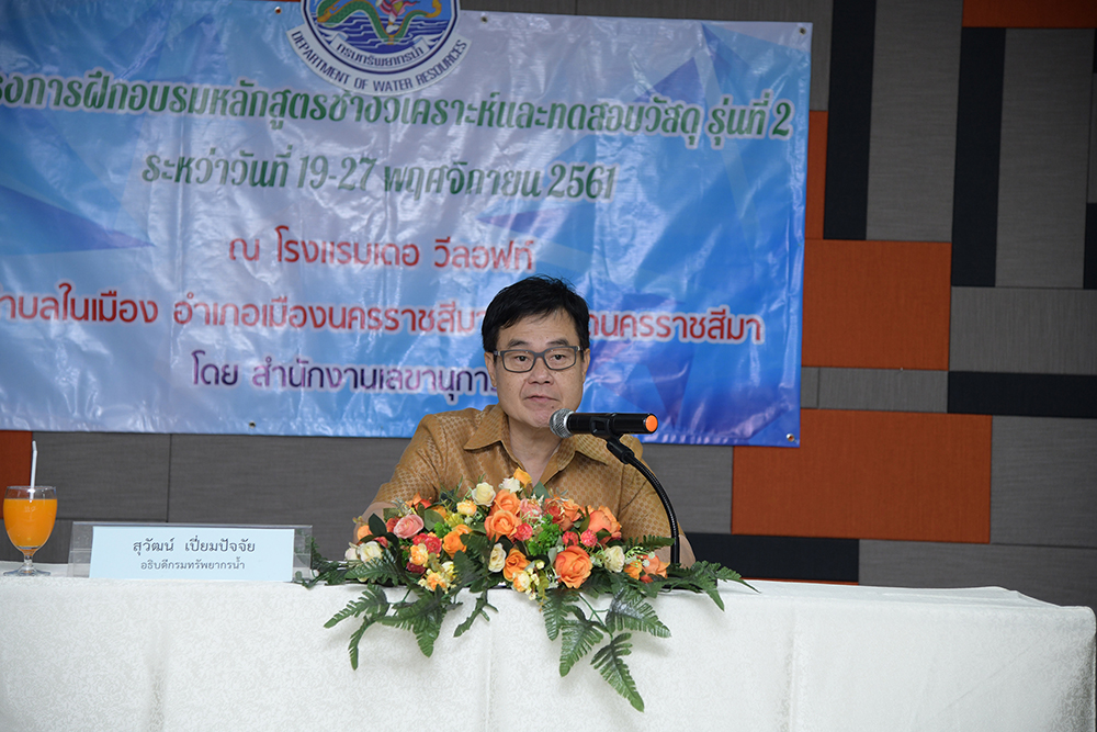 เมื่อวันที่ 28 พฤศจิกายน 2561 นายสุวัฒน์ เปี่ยมปัจจัย อธิบดีกรมทรัพยากรน้ำ เป็นประธานมอบประกาศนียบัตร พร้อมกล่าวปิดการฝึกอบรมโครงการหลักสูตรช่างวิเคราะห์และทดสอบวัสดุ รุ่นที่ 2 แก่ผู้เข้าร่วมฝึกอบรม ณ โรงแรมเดอ วี ลอฟท์ ตำบลในเมือง อำเภอเมือง จังหวัดนครราชสีมา โดยโครงการดังกล่าวจัดอบรมระหว่างวันที่ 19 - 27 พฤศจิกายน 2561 เพื่อให้ผู้เข้ารับการอบรมมีความรู้ความเข้าใจในการใช้เครื่องมือได้อย่างถูกต้อง มีประสิทธิภาพ สามารถทดสอบวัสดุที่เกี่ยวข้องกับการก่อสร้างและวิเคราะห์ค่ามาตรฐานได้อย่างถูกต้องแม่นยำ