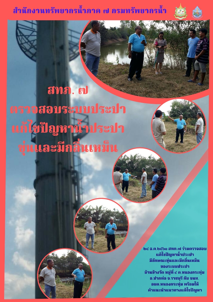 สำนักงานทรัพยากรน้ำภาค ๗ ร่วมตรวจสอบแก้ไขปัญหาน้ำประปามีลักษณะขุ่นและมีกลิ่นเหม็น