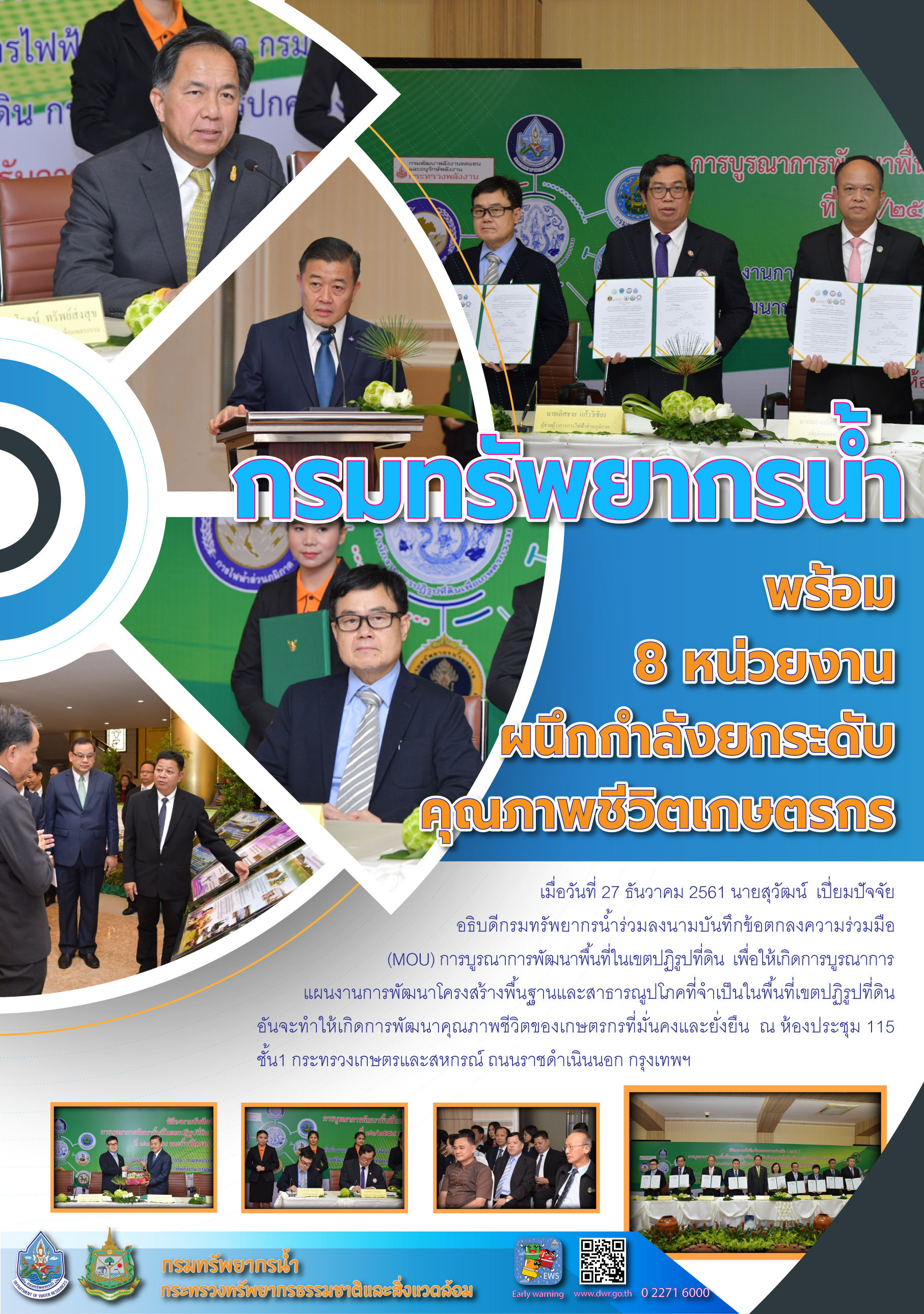 เมื่อวันที่ 27 ธันวาคม 2561 นายสุวัฒน์ เปี่ยมปัจจัย อธิบดีกรมทรัพยากรน้ำร่วมลงนามบันทึกข้อตกลงความร่วมมือ (MOU) การบูรณาการพัฒนาพื้นที่ในเขตปฏิรูปที่ดิน เพื่อให้เกิดการบูรณาการแผนงานการพัฒนาโครงสร้างพื้นฐานและสาธารณูปโภคที่จำเป็นในพื้นที่เขตปฏิรูปที่ดิน อันจะทำให้เกิดการพัฒนาคุณภาพชีวิตของเกษตรกรที่มั่นคงและยั่งยืน ณ ห้องประชุม 115 ชั้น1 กระทรวงเกษตรและสหกรณ์ ถนนราชดำเนินนอก กรุงเทพฯ