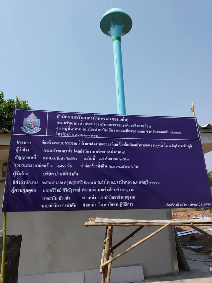 นายสาธิต สื่อประเสริฐสุข ผู้อำนวยการสำนักงานทรัพยากรน้ำภาค ๔ ติดตามงานโครงการระบบกระจายน้ำด้วยพลังงานแสงอาทิตย์ห้วยส้มป่อยบ้านท่าแตง ต.กุดน้ำใส อ.จัตุรัส จ.ชัยภูมิ ผลการก่อสร้าง 90% ประชาชนได้รับประโยชน์ 30 ครัวเรือน พื้นที่แปลงเกษตร 30 ไร่