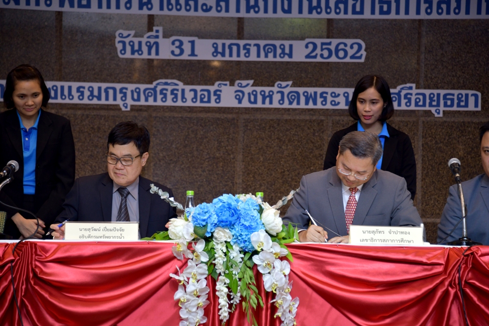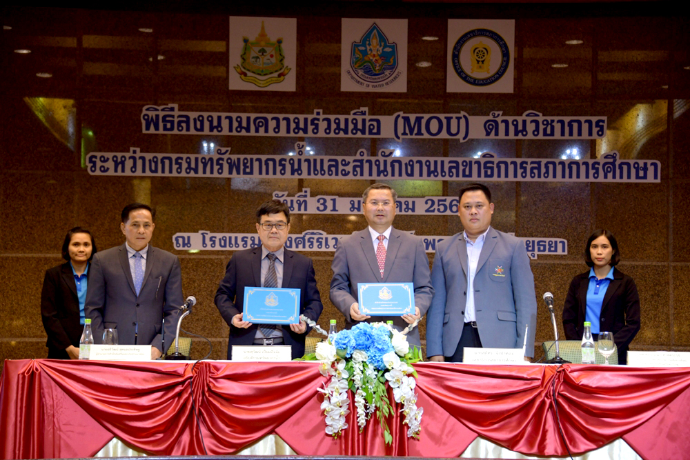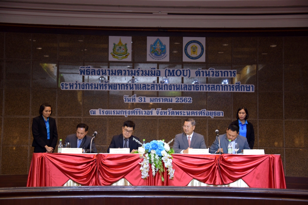 เมื่อวันที่ 31 มกราคม 2562 เวลา 13.30 น. กระทรวงทรัพยากรธรรมชาติและสิ่งแวดล้อม โดยอธิบดีกรมทรัพยากรน้ำ และสำนักงานเลขาธิการสภาการศึกษา ร่วมลงนามบันทึกข้อตกลงความร่วมมือทางวิชาการ เพื่อส่งเสริมการจัดการน้ำและสิ่งแวดล้อมให้เกิดประโยชน์สูงสุด ภายใต้นวัตกรรมและเครือข่ายที่เข้มแข็ง ณ โรงแรมกรุงศรีริเวอร์ จ.พระนครศรีอยุธยา