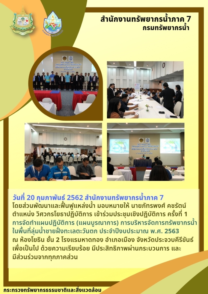 วันที่ 20 กุมภาพันธ์ 2562 สำนักงานทรัพยากรน้ำภาค 7 โดยส่วนพัฒนาและฟื้นฟูแหล่งน้ำ มอบหมายให้ นายภัทรพงศ์ คชรัตน์ ตำแหน่ง วิศวกรโยธาปฏิบัติการ เข้าร่วมประชุมเชิงปฏิบัติการ ครั้งที่ 1การจัดทำแผนปฏิบัติการ (แผนบูรณาการ) การบริหารจัดการทรัพยากรน้ำในพื้นที่ลุ่มน้ำชายฝั่งทะเลตะวันตก ประจำปีงบประมาณ พ.ศ. 2563 ณ ห้องโยธิน ชั้น 2 โรงแรมหาดทอง อำเภอเมือง จังหวัดประจวบคีรีขันธ์ เพื่อเป็นไปด้วยความเรียบร้อย มีประสิทธิภาพผ่านกระบวนการ และมีส่วนร่วมจากทุกภาคส่วน