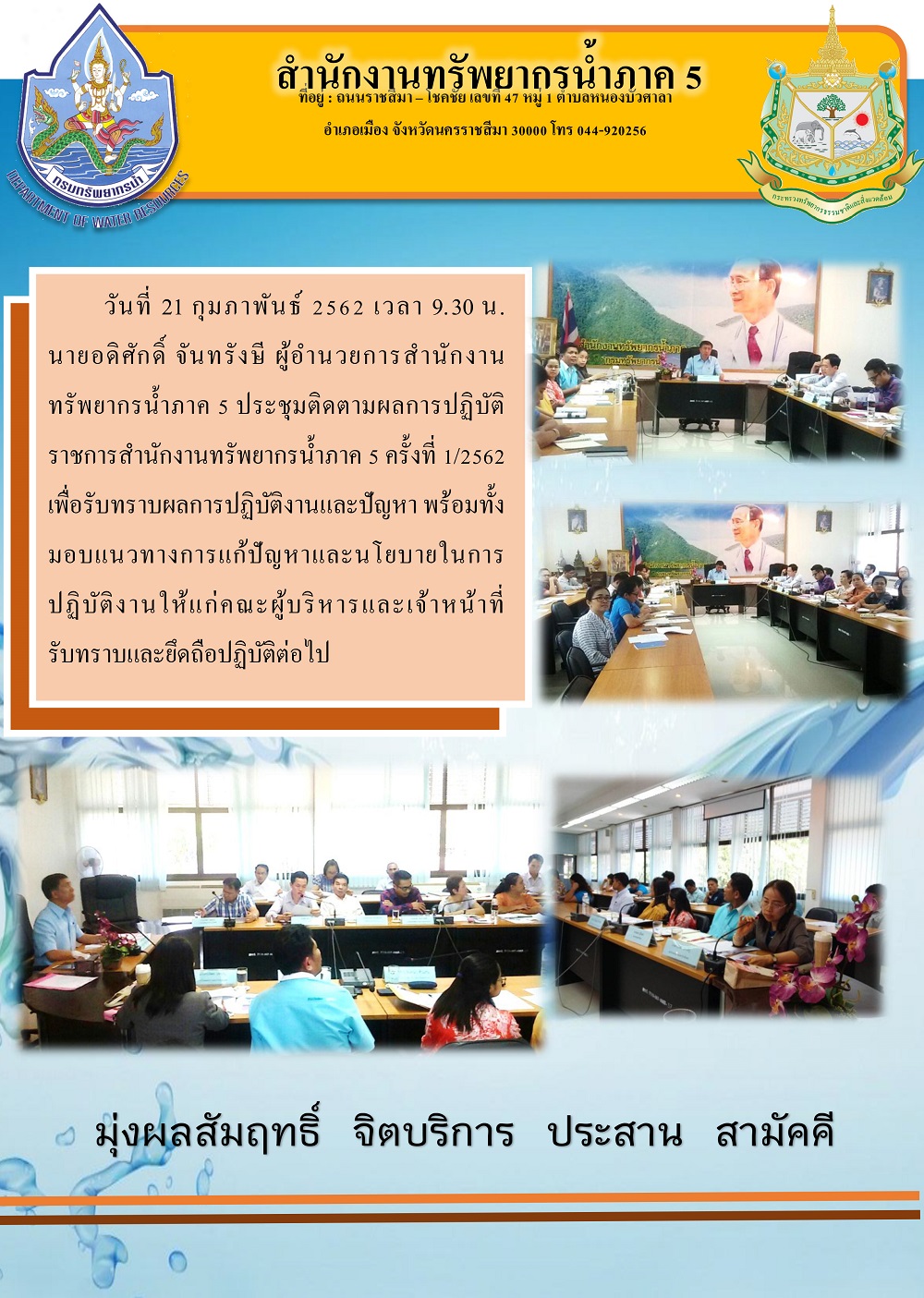 วันที่ 21 กุมภาพันธ์ 2562 เวลา 09.30-13.00 น. นายอดิศักดิ์ จันทรังษี ผู้อำนวยการสำนักงานทรัพยากรน้ำภาค 5 ประชุมติดตามผลการปฎิบัติราชการสำนักงานทรัพยากรน้ำภาค 5 ครั้งที่ 1/2562 ณ ห้องประชุมสำนักงานทรัพยากรน้ำภาค 5 เพื่อรับทราบผลการปฎิบัติงานรวมถึงปัญหาอุปสรรคในการปฎิบัติงาน พร้อมมอบแนวทางการแก้ปัญหาและนโยบายในการปฎิบัติงานให้แก่คณะผู้บริหารและเจ้าหน้าที่ ได้รับทราบและยึดถือเป็นแนวทางการปฎิบัติราชการให้บรรลุตามวัตถุประสงค์และภารกิจของกรมทรัพยากรน้ำต่อไป