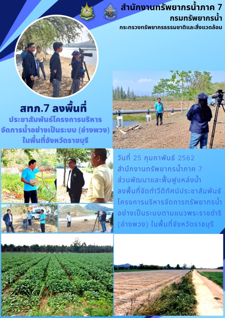 วันที่ 25 กุมภาพันธ์ 2562สำนักงานทรัพยากรน้ำภาค 7 ส่วนพัฒนาและฟื้นฟูแหล่งน้ำ ลงพื้นที่จัดทำวีดีทัศน์ประชาสัมพันธ์โครงการบริหารจัดการทรัพยากรน้ำอย่างเป็นระบบตามแนวพระราชดำริ (อ่างพวง) ในพื้นที่จังหวัดราชบุรี