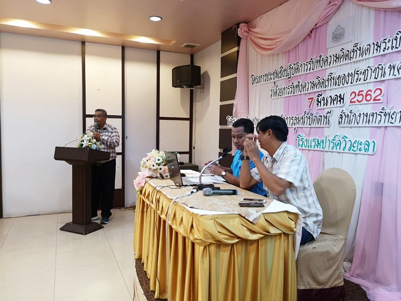 ระหว่างวันที่ 5-7 มีนาคม 2562 ผู้อำนวยการสำนักงานทรัพยากรน้ำภาค 8 มอบหมายให้ส่วนประสานและบริหารจัดการลุ่มน้ำปัดตานี จัดประชุมเชิงปฏิบัติการรับฟังความคิดเห็นตามระเบียบสำนักนายกรัฐมนตรีว่าด้วยการรับฟังความคิดเห็นของประชาชน พ.ศ. 2548 เรื่องการรับฟังประเด็นปัญหาข้อคิดเห็นต่าง ๆ ที่เกี่ยวข้องกับโครงการพัฒนาแหล่งน้ำ ในพื้นที่จังหวัดปีตตานี และจังหวัดยะลา โดยเป้าหมายเป็นกลุ่มของผู้มีส่วนได้ส่วนเสียในพื้นที่