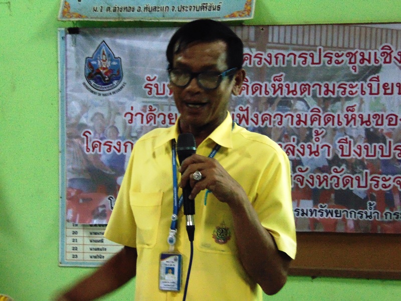 สำนักงานทรัพยากรน้ำภาค ๗ โดยส่วนประสานและบริหารจัดการลุ่มน้ำเพชรบุรีและประจวบคีรีขันธ์ จัดประชุมเชิงปฏิบัติการรับฟังความคิดเห็นตามระเบียบสำนักนายกรัฐมนตรี ว่าด้วยการรับฟังความคิดเห็นของประชาชน พ.ศ. ๒๕๔๘ โครงการอนุรักษ์ฟื้นฟูแหล่งน้ำ ประจำปีงบประมาณ ๒๕๖๒ (งบประมาณเหลือจ่าย) โครงการอนุรักษ์ฟื้นฟูแหล่งน้ำคลองตาจิตร (คลองแก่ง) หมู่ที่ ๑ ตำบลอ่างทอง อำเภอทับสะแก จังหวัดประจวบคีรีขันธ์ ณ ศาลาอเนกประสงค์หมู่บ้าน หมู่ที่ ๑ ตำบลอ่างทอง อำเภอทับสะแก จังหวัดประจวบคีรีขันธ์ วันจันทร์ที่ ๔ มีนาคม ๒๕๖๒ เวลา ๑๘.๐๐ น. โดย นายปรีดา สุขใจ นายอำเภอทับสะแก ร่วมประชุมรับฟังฯ นายเชตุ จันทร์ถิ นักวิเคราะห์นโยบายและแผนชำนาญการ ชี้แจงเหตุผลความจำเป็นและวัตถุประสงค์ของการรับฟังความคิดเห็นของประชาชนตามระเบียบสำนักนายกรัฐมนตรีฯ และนายสมชาย อาจชนะ นายช่างโยธาชำนาญงาน ชี้แจงรายละเอียดโครงการ ผู้เข้าร่วมประชุม จำนวน ๖๑ คน ที่ประชุมมีมติเห็นชอบให้ดำเนินโครงการ
