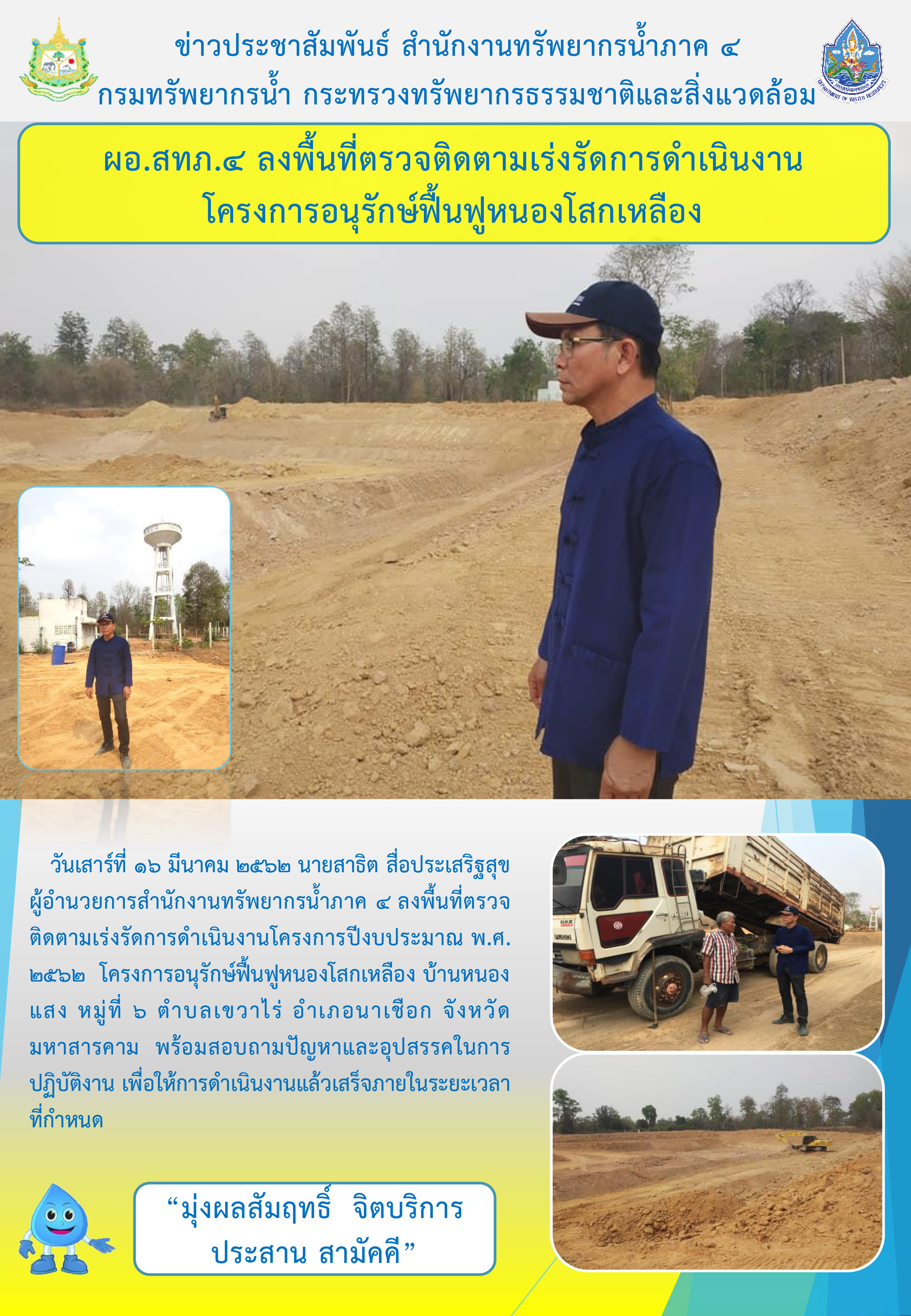 วันเสาร์ที่ 16 มีนาคม 2562 นายสาธิต สื่อประเสริฐสุข ผู้อำนวยการสำนักงานทรัพยากรน้ำภาค 4 ลงพื้นที่ตรวจติดตามเร่งรัดการดำเนินงานโครงการปีงบประมาณ พ.ศ. 2562 โครงการอนุรักษ์ฟื้นฟูหนองโสกเหลือง บ้านหนองแสง หมู่ที่ 6 ตำบลเขวาไร่ อำเภอนาเชือก จังหวัดมหาสารคาม พร้อมสอบถามปัญหาและอุปสรรคในการปฏิบัติงาน เพื่อให้การดำเนินงานแล้วเสร็จภายในระยะเวลาที่กำหนด